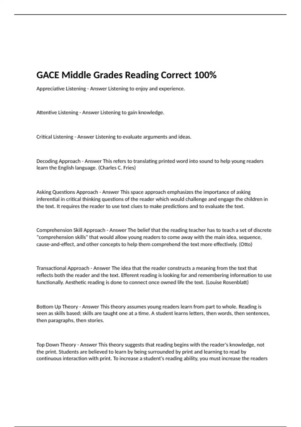 Appreciative Listening - Answer Listening to enjoy and experience. Attentive Listening - Answer Listening to gain knowledge. Critical Listening - Answer Listening to evaluate arguments and ideas. Decoding Approach - Answer This refers to translating printed word into sound to help young readers learn the English language. (Charles C. Fries) Asking Questions Approach - Answer This space approach emphasizes the importance of asking inferential in critical thinking questions of the reader which would challenge and engage the children in the text. It requires the reader to use text clues to make predictions and to evaluate the text. Comprehension Skill Approach - Answer The belief that the reading teacher has to teach a set of discrete "comprehension skills" that would allow young readers to come away with the main idea, sequence, cause-and-effect, and other concepts to help them comprehend the text more effectively. (Otto) Transactional Approach - Answer The idea that the reader constructs a meaning from the text that reflects both the reader and the text. Efferent reading is looking for and remembering information to use functionally. Aesthetic reading is done to connect once owned life the text. (Louise Rosenblatt) Bottom Up Theory - Answer This theory assumes young readers learn from part to whole. Reading is seen as skills based; skills are taught one at a time. A student learns letters, then words, then sentences, then paragraphs, then stories. Top Down Theory - Answer This theory suggests that reading begins with the reader's knowledge, not the print. Students are believed to learn by being surrounded by print and learning to read by continuous interaction with print. To increase a student's reading ability, you must increase the readers knowledge. Balance Literacy Approach - Answer This approach encourages the use of "real literature". Advocates argue that real literature engages young readers, promotes lifelong reading, offers readers a language base, and is easier to learn. John Munro - Answer This person studied the effects of reading aloud. Stated that reading aloud allows the reader to make a link between the printed word, the sound of a word, and the meaning of a word to allow the reader to make connections that will help them become better readers and comprehend what they are reading. Brian Camborne - Answer This person proposed that children acquire early facility with oral and written language most easily when certain conditions are present in their environments, both at home and school. He came up with eight conditions to help students become better readers. Marylin Jager Adams - Answer This person focuses on a more 1on1 reading approach with less focus on phonics and more on reading comprehension skills. The Emergent Reading Approach frees up and engages students in the reading and helps them comprehend what they are reading. Lucy Calkins - Answer This person developed a reading program that helps students learn to read by incorporating quiet reading, reading journals in which students had to write about what they read, and small group discussions about what they read. This approach allows students to improve reading and writing skills because they are intertwined. Jerome Bruner - Answer This person believes that young children learn to read not for reading sake but in order to socialize. They crack the linguistic code in order to communicate. Thus reading teachers should teach reading in such a way that the student learns to read in order to communicate. J. David Cooper - Answer This person advocates for a experience based reading approach. The student can construct meaning to what they're reading based on previous experiences. The teacher needs to help students make the connection between what they know and what they're reading about. Marie Clay - Answer This person develop a reading program called Reading Recovery. Ahis program focuses on a whole language approach in which there is more focus on students learning words rather than phonetic sounds. Instead of tedious repetition of phonetic sounds and memorization, students learn to read by reading "real literature." Oral Reading Progress Assessment. Sharon Taberski - Answer This person developed the "pillars" of reading: accurate fluent reading, background knowledge, oral language and vocabulary, reading - writing connections, and repertorie of strategies. Rudolf Flesch - Answer This person advocated against the whole langauge approach in favor of the phonic approach. Phonemic Awareness - Answer A subset of Phonological Awareness in which listeners are able to hear, identify and manipulate phonemes, the smallest units of sound that can differentiate meaning. Phonological Awareness - Answer This refers to an individual's awareness of the phonological structure, or sound structure, of spoken words. Can be reliable predictor of later reading ability. Oddity Task - Answer Identification of an odd sound within a series of similar sounds. Balanced Literacy Approach - Answer Assessment-based planning is at the core of this model. It is characterized by explicit skill instruction and the use of authentic texts. Several modialities of literacy are used to teach students how to read for themselves. Ability Grouping - Answer Grouping of children with similar needs for instructional purposes. Groups may change throughout the year based on the changing needs of the student. Assonance - Answer The resemblance of sounds. Alliteration - Answer The use of the same consonant or of a vowel, not necessarily the same vowel at the beginning of each word or each stressed syllable in a line of verse, as in around the rock the ragged rascal ran. Rhyming - Answer Identity in sound of some part, especially the end, of words or lines of verse. Anchor Book - Answer A book used to teach reading and writing. A balnced literacy term. Alphabetic Principle - Answer The idea that written spellings represent spoken words.