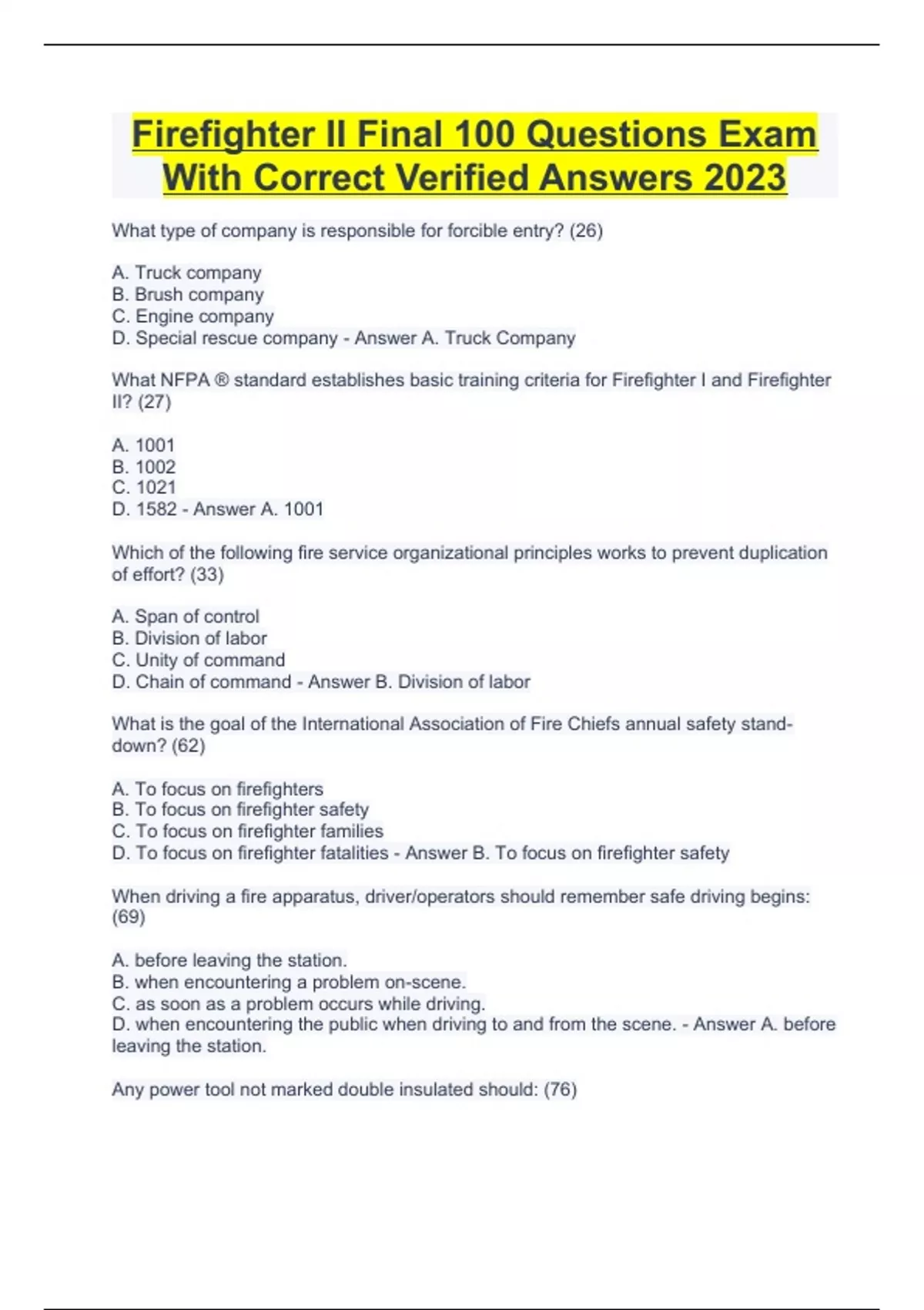 BUNDLE OF FIREFIGHTER 2 FINAL EXAMS 2023 TEST QUESTIONS WITH VERIFIED CORRECT ANSWERS WELL ELABORATED