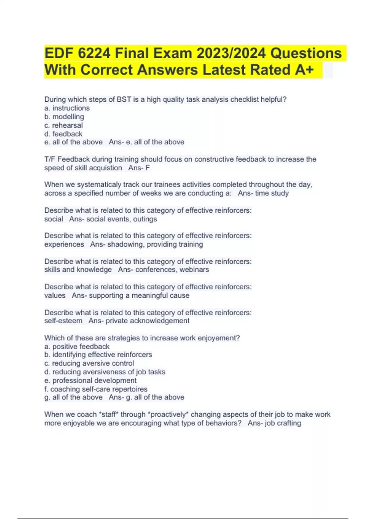 EDF 6224 Final Exam 2023/2024 Questions With Correct Answers Latest Rated A+. During which steps of BST is a high quality task analysis checklist helpful? a. instructions b. modelling c. rehearsal d. feedback e. all of the above Ans- e. all of the above T/F Feedback during training should focus on constructive feedback to increase the speed of skill acquistion Ans- F When we systematicaly track our trainees activities completed throughout the day, across a specified number of weeks we are conducting a: Ans- time study Describe what is related to this category of effective reinforcers: social Ans- social events, outings Describe what is related to this category of effective reinforcers: experiences Ans- shadowing, providing training Describe what is related to this category of effective reinforcers: skills and knowledge Ans- conferences, webinars Describe what is related to this category of effective reinforcers: values Ans- supporting a meaningful cause Describe what is related to this category of effective reinforcers: self-esteem Ans- private acknowledgement Which of these are strategies to increase work enjoyement? a. positive feedback b. identifying effective reinforcers c. reducing aversive control d. reducing aversiveness of job tasks e. professional development f. coaching self-care repertoires g. all of the above Ans- g. all of the above When we coach *staff* through *proactively* changing aspects of their job to make work more enjoyable we are encouraging what type of behaviors? Ans- job crafting