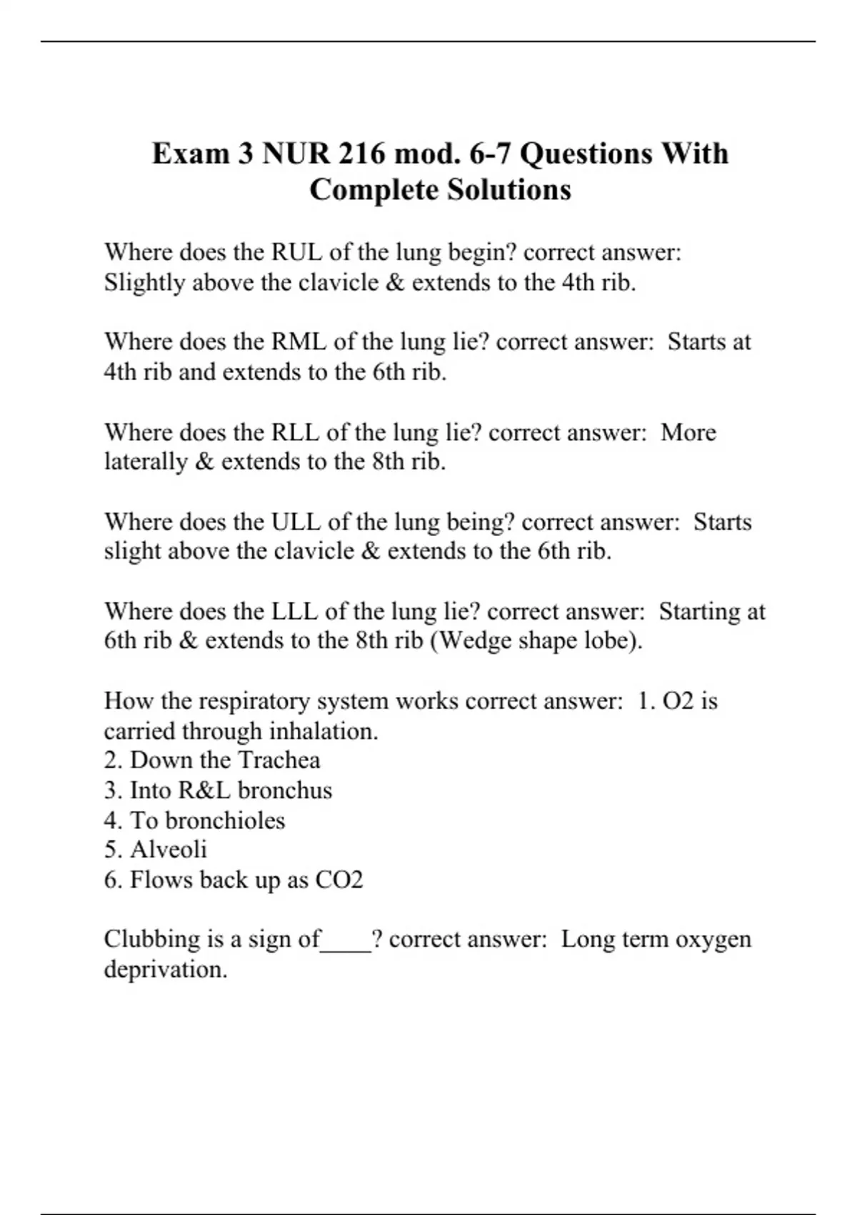 Where does the RUL of the lung begin? correct answer: Slightly above the clavicle & extends to the 4th rib. Where does the RML of the lung lie? correct answer: Starts at 4th rib and extends to the 6th rib. Where does the RLL of the lung lie? correct answer: More laterally & extends to the 8th rib. Where does the ULL of the lung being? correct answer: Starts slight above the clavicle & extends to the 6th rib. Where does the LLL of the lung lie? correct answer: Starting at 6th rib & extends to the 8th rib (Wedge shape lobe). How the respiratory system works correct answer: 1. O2 is carried through inhalation. 2. Down the Trachea 3. Into R&L bronchus 4. To bronchioles 5. Alveoli 6. Flows back up as CO2 Clubbing is a sign of____? correct answer: Long term oxygen deprivation. Inspection & obtaining objective
