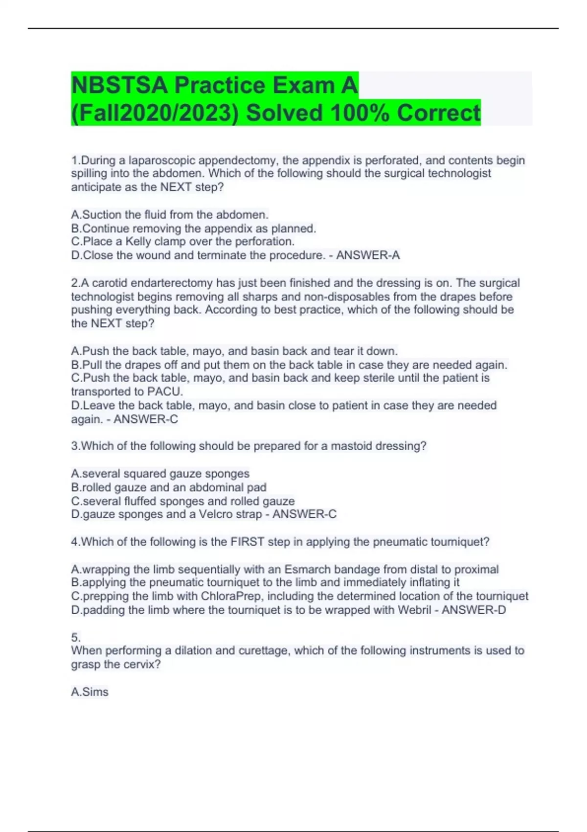 1.During a laparoscopic appendectomy, the appendix is perforated, and contents begin spilling into the abdomen. Which of the following should the surgical technologist anticipate as the NEXT step? A.Suction the fluid from the abdomen. B.Continue removing the appendix as planned. C.Place a Kelly clamp over the perforation. D.Close the wound and terminate the procedure. - ANSWER-A 2.A carotid endarterectomy has just been finished and the dressing is on. The surgical technologist begins removing all sharps and non-disposables from the drapes before pushing everything back. According to best practice, which of the following should be the NEXT step? A.Push the back table, mayo, and basin back and tear it down. B.Pull the drapes off and put them on the back table in case they are needed again. C.Push the back table, mayo, and basin back and keep sterile until the patient is transported to PACU. D.Leave the back table, mayo, and basin close to patient in case they are needed again. - ANSWER-C 3.Which of the following should be prepared for a mastoid dressing? A.several squared gauze sponges B.rolled gauze and an abdominal pad C.several fluffed sponges and rolled gauze D.gauze sponges and a Velcro strap - ANSWER-C 4.Which of the following is the FIRST step in applying the pneumatic tourniquet? A.wrapping the limb sequentially with an Esmarch bandage from distal to proximal B.applying the pneumatic tourniquet to the limb and immediately inflating it C.prepping the limb with ChloraPrep, including the determined location of the tourniquet D.padding the limb where the tourniquet is to be wrapped with Webril - ANSWER-D 5. When performing a dilation and curettage, which of the following instruments is used to grasp the cervix? A.Sims B.Auvard C.Schroeder D. Bozeman - ANSWER-C 6. How many lobes do the right and left lungs have, respectively? A.three, two B.two, three C.three, three D.two, two - ANSWER-A 7. When a break in aseptic technique occurs, the surgical technologist should FIRST notify the A.circulating nurse. B.contaminating team member. C.OR supervisor. D.anesthesia provider. - ANSWER-B 8. Which of the following pathological conditions may be caused by an excessive production of cerebrospinal fluid in the brain? A.hydrocephalus B.encephalocele C.cranial bifida D.craniosynostosis - ANSWER-A 9. If unexpected heavy blood loss occurs during an abdominal procedure, a surgical technologist should request additional A.lap sponges. B.Raytec sponges. C.Kitners. D.cottonoids. - ANSWER-A 10. Growth in the length of a long bone occurs at the A.diaphysis. B.medullary canal. C.epiphyseal plate. D.articular cartilage. - ANSWER-C