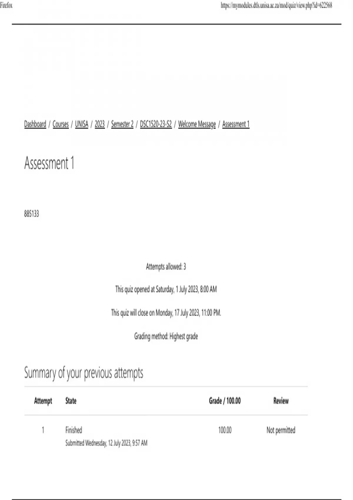 Dashboard / Courses / UNISA / 2023 / Semester 2 / DSC1520-23-S2 / Welcome Message / Assessment 1
