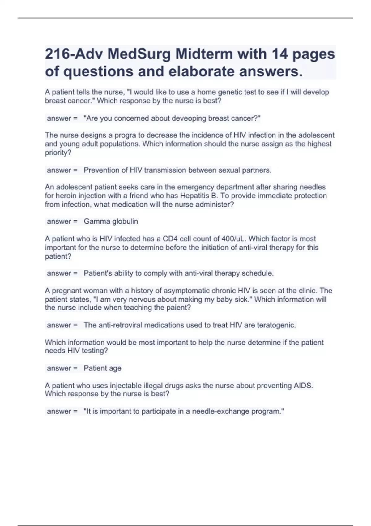 216-Adv MedSurg Midterm with 14 pages of questions and elaborate answers.
