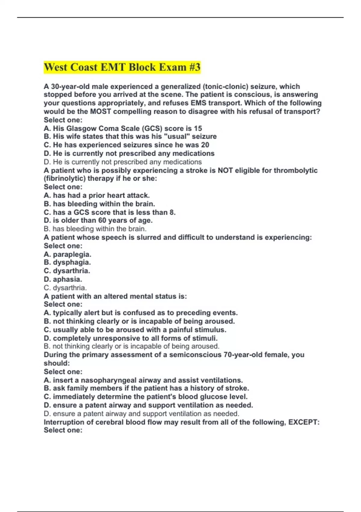 and slurred speech. His airway is patent, his respirations are 14 breaths/min with