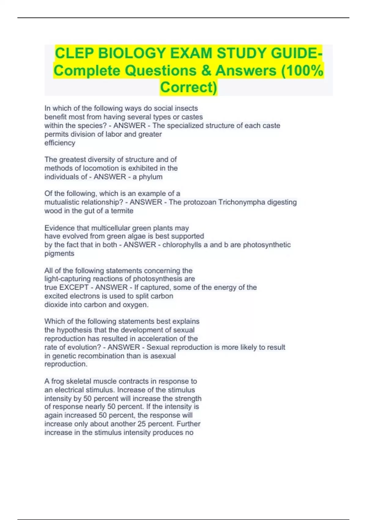 CLEP BIOLOGY EXAM STUDY GUIDE- Complete Questions & Answers (100% Correct) CLEP BIOLOGY EXAM STUDY GUIDE- Complete Questions & Answers (100% Correct) In which of the following ways do social insects benefit most from having several types or castes within the species? - ANSWER - The specialized structure of each caste permits division of labor and greater efficiency The greatest diversity of structure and of methods of locomotion is exhibited in the individuals of - ANSWER - a phylum Of the following, which is an example of a mutualistic relationship? - ANSWER - The protozoan Trichonympha digesting wood in the gut of a termite Evidence that multicellular green plants may have evolved from green algae is best supported by the fact that in both - ANSWER - chlorophylls a and b are photosynthetic pigments All of the following statements concerning the light-capturing reactions of photosynthesis are true EXCEPT - ANSWER - If captured, some of the energy of the excited electrons is used to split carbon dioxide into carbon and oxygen. Which of the following statements best explains the hypothesis that the development of sexual reproduction has resulted in acceleration of the rate of evolution? - ANSWER - Sexual reproduction is more likely to result in genetic recombination than is asexual reproduction. A frog skeletal muscle contracts in response to an electrical stimulus. Increase of the stimulus intensity by 50 percent will increase the strength of response nearly 50 percent. If the intensity is again increased 50 percent, the response will increase only about another 25 percent. Further increase in the stimulus intensity produces no further increase in response. - ANSWER - The fibers of a muscle have varying thresholds for response