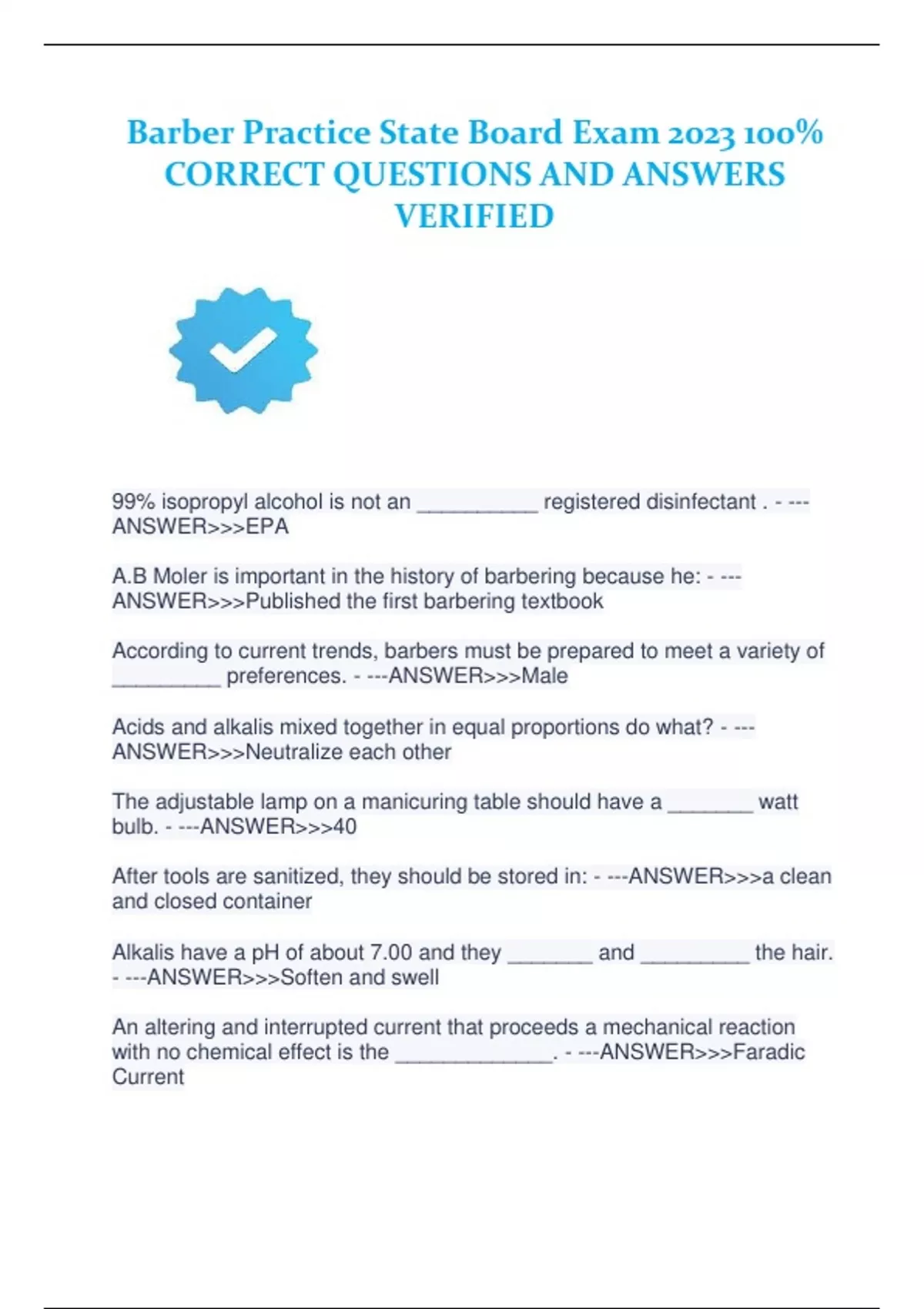 Barber Practice State Board Exam 2023 100% CORRECT QUESTIONS AND ANSWERS VERIFIED