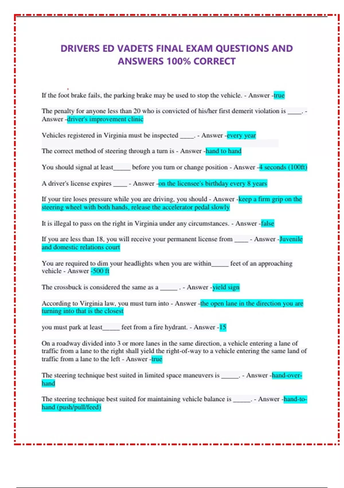 DRIVERS ED VADETS FINAL EXAM QUESTIONS AND ANSWERS 100% CORRECT If the foot brake fails, the parking brake may be used to stop the vehicle. - Answer -true The penalty for anyone less than 20 who is convicted of his/her first demerit violation is ____. - Answer -driver's improvement clinic Vehicles registered in Virginia must be inspected ____. - Answer -every year The correct method of steering through a turn is - Answer -hand to hand You should signal at least_____ before you turn or change position - Answer -4 seconds (100ft) A driver's license expires ____ - Answer -on the licensee's birthday every 8 years If your tire loses pressure while you are driving, you should - Answer -keep a firm grip on the steering wheel with both hands, release the accelerator pedal slowly It is illegal to pass on the right in Virginia under any circumstances. - Answer -false If you are less than 18, you will receive your permanent license from ____ - Answer -Juvenile and domestic relations court You are required to dim your headlights when you are within_____ feet of an approaching vehicle - Answer -500 ft The crossbuck is considered the same as a _____ . - Answer -yield sign According to Virginia law, you must turn into - Answer -the open lane in the direction you are turning into that is the closest you must park at least_____ feet from a fire hydrant. - Answer -15 On a roadway divided into 3 or more lanes in the same direction, a vehicle entering a lane of traffic from a lane to the right shall yield the right-of-way to a vehicle entering the same land of traffic from a lane to the left - Answer -true The steering technique best suited in limited space maneuvers is _____. - Answer -hand-over-hand The steering technique best suited for maintaining vehicle balance is _____. - Answer -hand-to-hand (push/pull/feed)