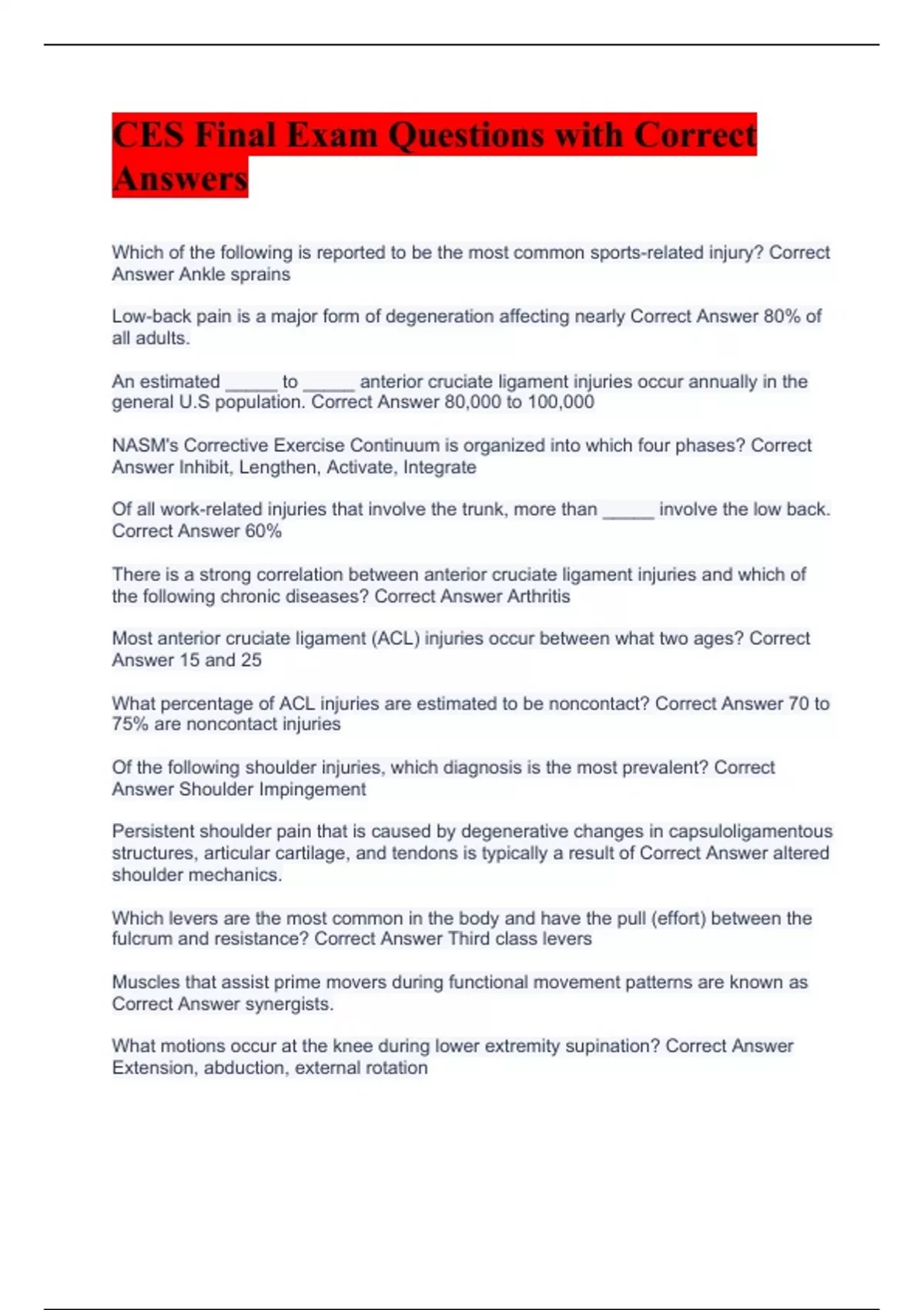 Which of the following is reported to be the most common sports-related injury? Correct Answer Ankle sprains Low-back pain is a major form of degeneration affecting nearly Correct Answer 80% of all adults. An estimated _____ to _____ anterior cruciate ligament injuries occur annually in the general U.S population. Correct Answer 80,000 to 100,000 NASM's Corrective Exercise Continuum is organized into which four phases? Correct Answer Inhibit, Lengthen, Activate, Integrate Of all work-related injuries that involve the trunk, more than _____ involve the low back. Correct Answer 60% There is a strong correlation between anterior cruciate ligament injuries and which of the following chronic diseases? Correct Answer Arthritis Most anterior cruciate ligament (ACL) injuries occur between what two ages? Correct Answer 15 and 25 What percentage of ACL injuries are estimated to be noncontact? Correct Answer 70 to 75% are noncontact injuries Of the following shoulder injuries, which diagnosis is the most prevalent? Correct Answer Shoulder Impingement Persistent shoulder pain that is caused by degenerative changes in capsuloligamentous structures, articular cartilage, and tendons is typically a result of Correct Answer altered shoulder mechanics. Which levers are the most common in the body and have the pull (effort) between the fulcrum and resistance? Correct Answer Third class levers Muscles that assist prime movers during functional movement patterns are known as Correct Answer synergists. What motions occur at the knee during lower extremity supination? Correct Answer Extension, abduction, external rotation