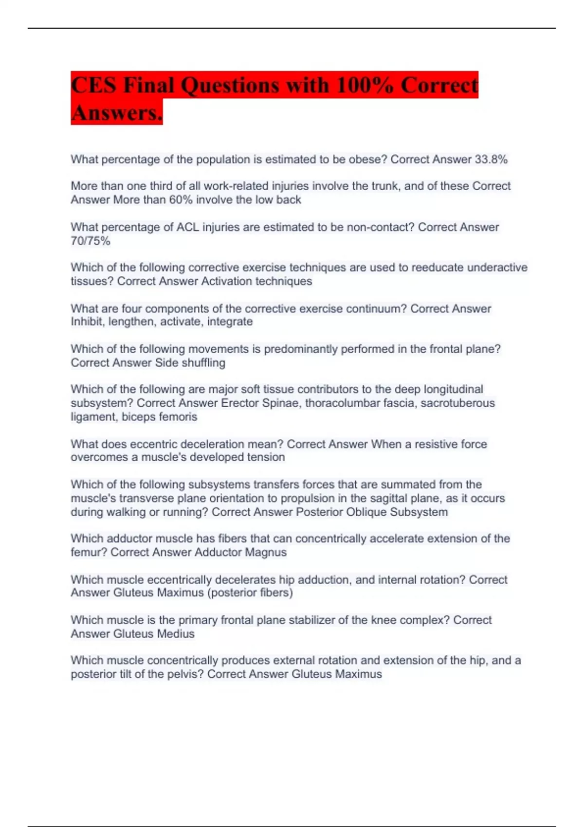 What percentage of the population is estimated to be obese? Correct Answer 33.8% More than one third of all work-related injuries involve the trunk, and of these Correct Answer More than 60% involve the low back What percentage of ACL injuries are estimated to be non-contact? Correct Answer 70/75% Which of the following corrective exercise techniques are used to reeducate underactive tissues? Correct Answer Activation techniques What are four components of the corrective exercise continuum? Correct Answer Inhibit, lengthen, activate, integrate Which of the following movements is predominantly performed in the frontal plane? Correct Answer Side shuffling Which of the following are major soft tissue contributors to the deep longitudinal subsystem? Correct Answer Erector Spinae, thoracolumbar fascia, sacrotuberous ligament, biceps femoris What does eccentric deceleration mean? Correct Answer When a resistive force overcomes a muscle's developed tension Which of the following subsystems transfers forces that are summated from the muscle's transverse plane orientation to propulsion in the sagittal plane, as it occurs during walking or running? Correct Answer Posterior Oblique Subsystem Which adductor muscle has fibers that can concentrically accelerate extension of the femur? Correct Answer Adductor Magnus Which muscle eccentrically decelerates hip adduction, and internal rotation? Correct Answer Gluteus Maximus (posterior fibers) Which muscle is the primary frontal plane stabilizer of the knee complex? Correct Answer Gluteus Medius Which muscle concentrically produces external rotation and extension of the hip, and a posterior tilt of the pelvis? Correct Answer Gluteus Maximus
