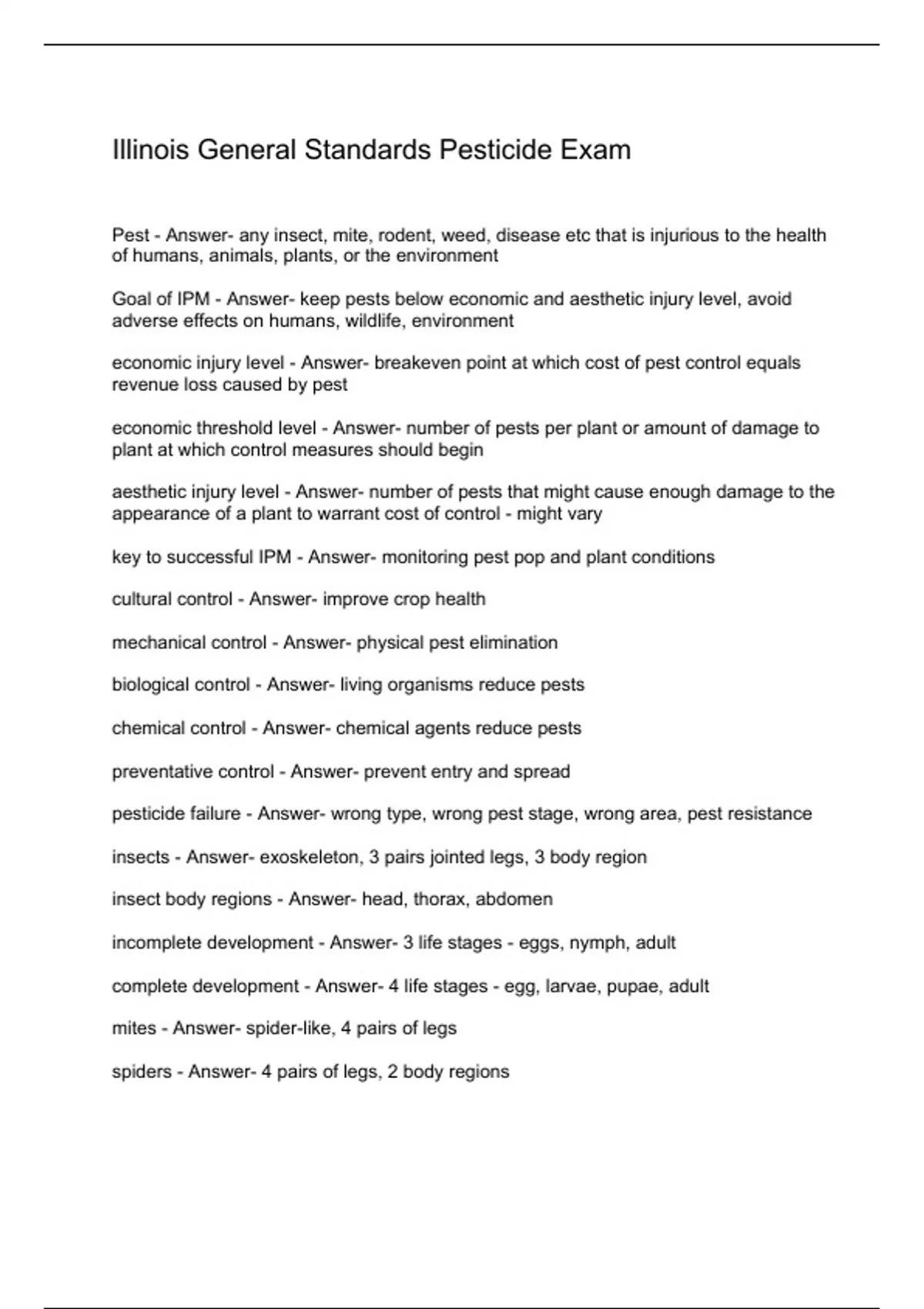 Pest - Answer- any insect, mite, rodent, weed, disease etc that is injurious to the health of humans, animals, plants, or the environment Goal of IPM - Answer- keep pests below economic and aesthetic injury level, avoid adverse effects on humans, wildlife, environment economic injury level - Answer- breakeven point at which cost of pest control equals revenue loss caused by pest economic threshold level - Answer- number of pests per plant or amount of damage to plant at which control measures should begin aesthetic injury level - Answer- number of pests that might cause enough damage to the appearance of a plant to warrant cost of control - might vary key to successful IPM - Answer- monitoring pest pop and plant conditions cultural control - Answer- improve crop health mechanical control - Answer- physical pest elimination biological control - Answer- living organisms reduce pests chemical control - Answer- chemical agents reduce pests preventativ