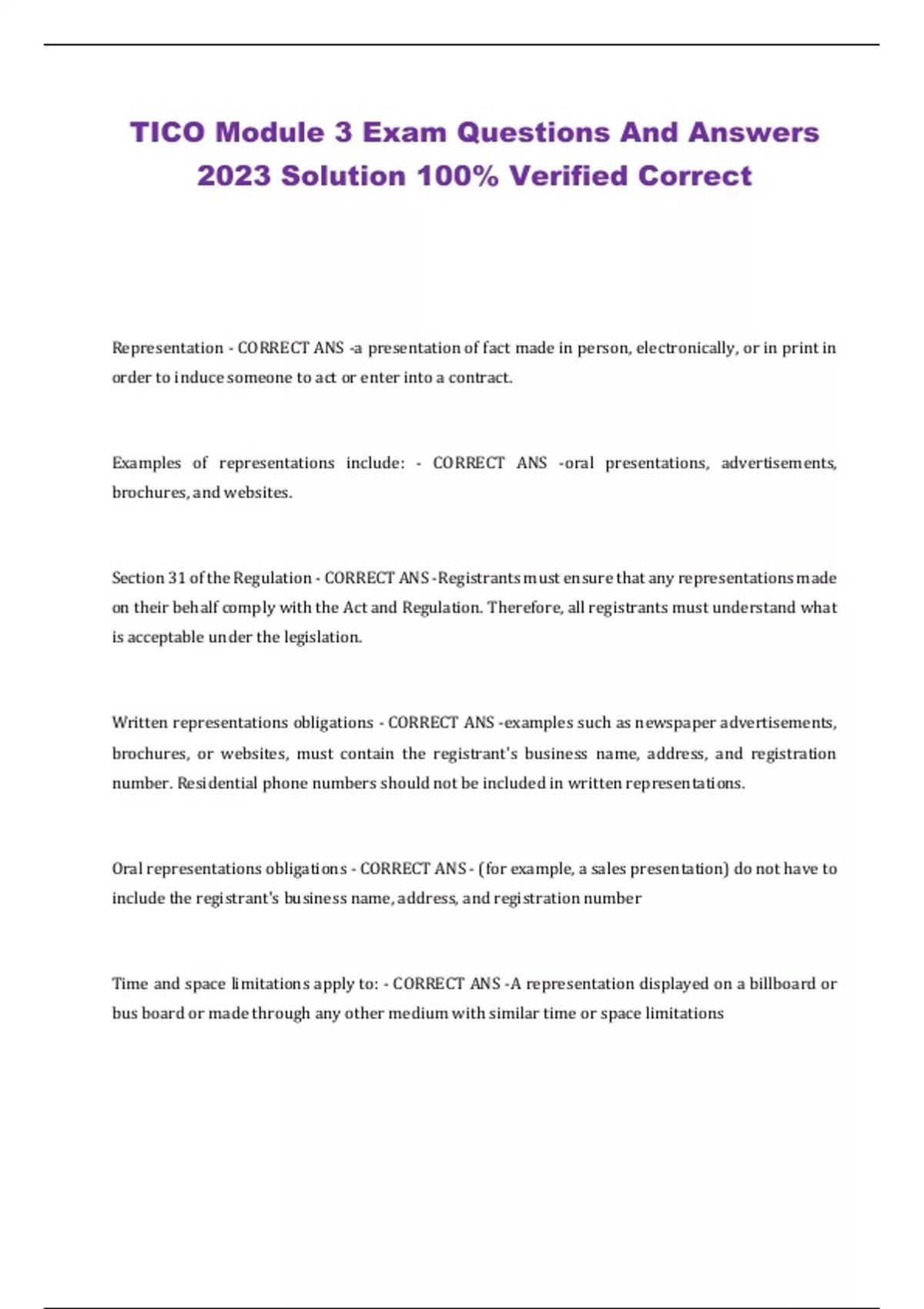 TICO Module 3 Exam Questions And Answers 2023 Solution 100% Verified Correct Representation - CORRECT ANS -a presentation of fact made in person, electronically, or in print in order to induce someone to act or enter into a contract. Examples of representations include: - CORRECT ANS -oral presentations, advertisements, brochures, and websites. Section 31 of the Regulation - CORRECT ANS -Registrants must ensure that any representations made on their behalf comply with the Act and Regulation. Therefore, all registrants must understand what is acceptable under the legislation. Written representations obligations - CORRECT ANS -examples such as newspaper advertisements, brochures, or websites, must contain the registrant's business name, address, and registration number. Residential phone numbers should not be included in written representations. Oral representations obligations - CORRECT ANS - (for example, a sales presentation) do not have to include the registrant's business name, address, and registration number Time and space limitations apply to: - CORRECT ANS -A representation displayed on a billboard or bus board or made through any other medium with similar time or space limitations Time and space limitations are not required to: - CORRECT ANS -include a registrant's business name, address, and registration number.