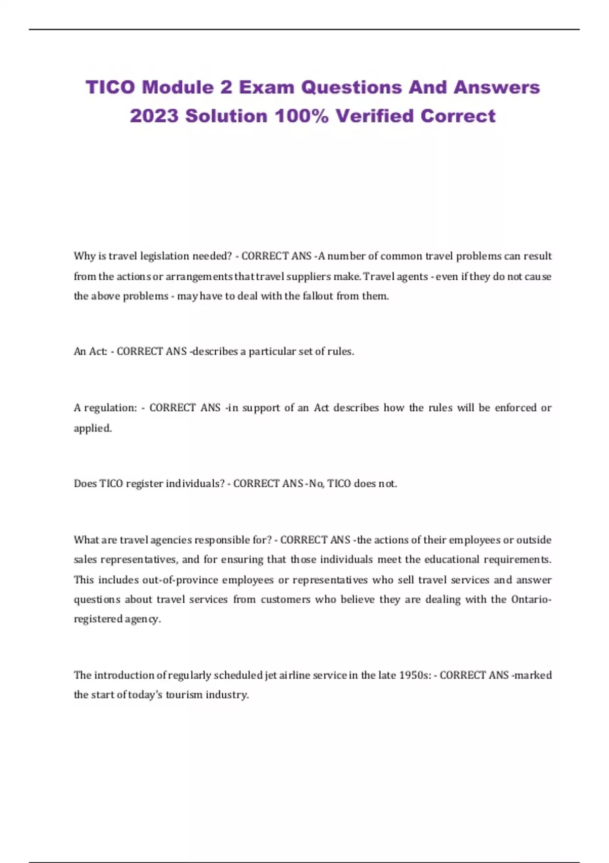 TICO Module 2 Exam Questions And Answers 2023 Solution 100% Verified Correct Why is travel legislation needed? - CORRECT ANS -A number of common travel problems can result from the actions or arrangements that travel suppliers make. Travel agents - even if they do not cause the above problems - may have to deal with the fallout from them. An Act: - CORRECT ANS -describes a particular set of rules. A regulation: - CORRECT ANS -in support of an Act describes how the rules will be enforced or applied. Does TICO register individuals? - CORRECT ANS -No, TICO does not. What are travel agencies responsible for? - CORRECT ANS -the actions of their employees or outside sales representatives, and for ensuring that those individuals meet the educational requirements. This includes out-of-province employees or representatives who sell travel services and answer questions about travel services from customers who believe they are dealing with the Ontario-registered agency. The introduction of regularly scheduled jet airline service in the late 1950s: - CORRECT ANS -marked the start of today's tourism industry. What brought larger and faster planes in the 1960s? - CORRECT ANS -Technological developments Who were the first to realize the potential of "bulk buying" for the travel industry? - CORRECT ANS -the Europeans