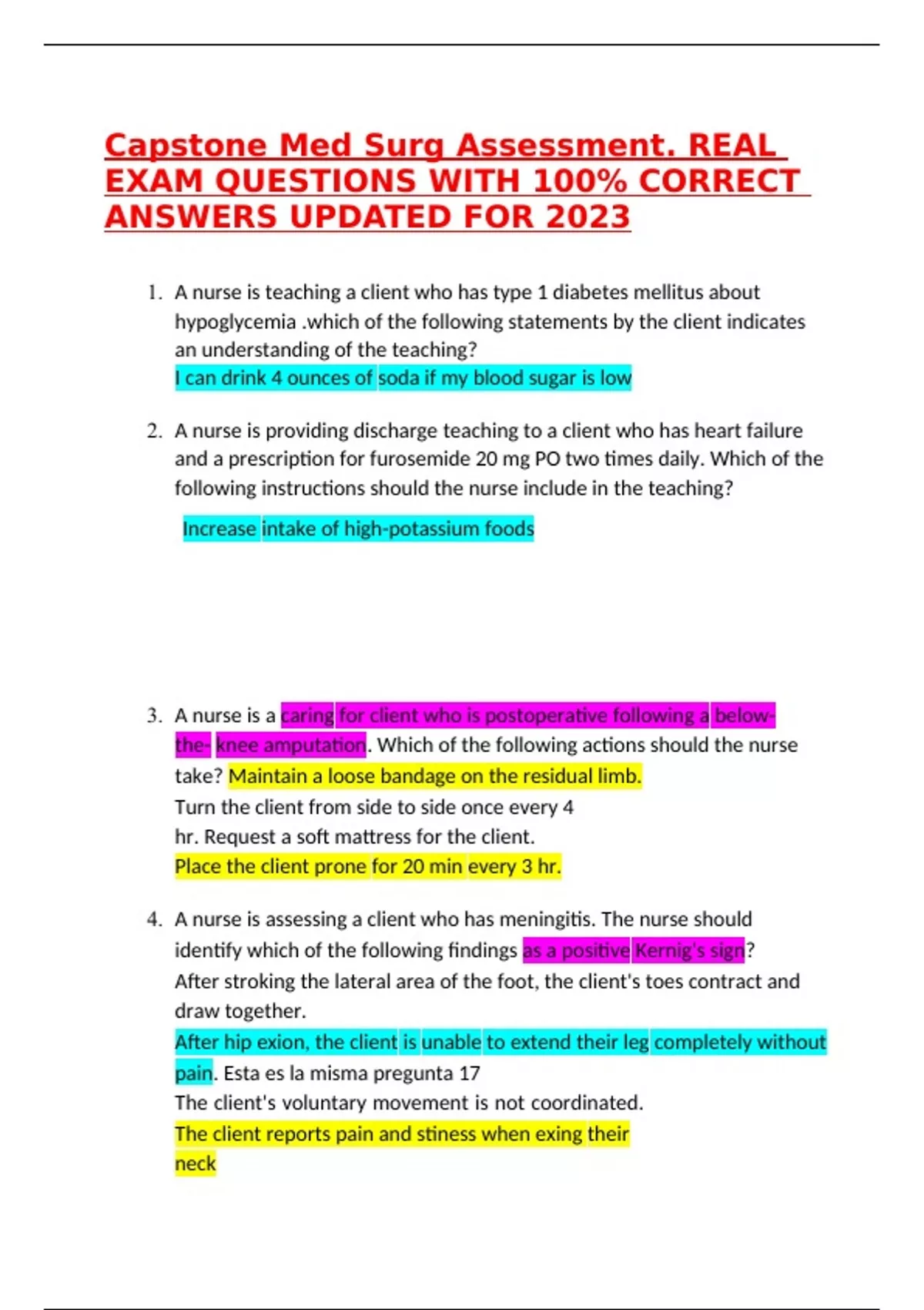 Capstone Med Surg Assessment. REAL EXAM QUESTIONS WITH 100% CORRECT ANSWERS UPDATED FOR 2023