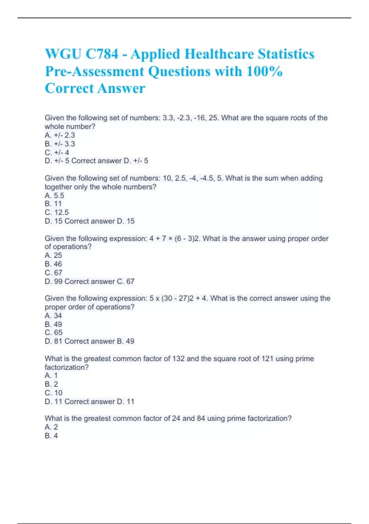 Given the following set of numbers: 3.3, -2.3, -16, 25. What are the square roots of the whole number? A. +/- 2.3 B. +/- 3.3 C. +/- 4 D. +/- 5 Correct answer D. +/- 5 Given the following set of numbers: 10, 2.5, -4, -4.5, 5. What is the sum when adding together only the whole numbers? A. 5.5 B. 11 C. 12.5 D. 15 Correct answer D. 15 Given the following expression: 4 + 7 × (6 - 3)2. What is the answer using proper order of operations? A. 25 B. 46 C. 67 D. 99 Correct answer C. 67 Given the following expression: 5 x (30 - 27)2 + 4. What is the correct answer using the proper order of operations? A. 34 B. 49 C. 65 D. 81 Correct answer B. 49 What is the greatest common factor of 132 and the square root of 121 using prime factorization? A. 1 B. 2 C. 10 D. 11 Correct answer D. 11 What is the greatest common factor of 24 and 84 using prime factorization? A. 2 B. 4
