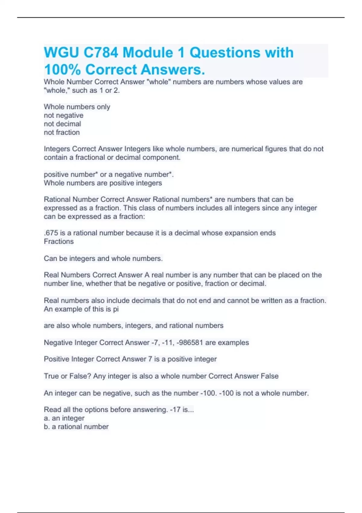 WGU C784 Module 1 Questions with 100% Correct Answers. Whole Number Correct Answer "whole" numbers are numbers whose values are "whole," such as 1 or 2.