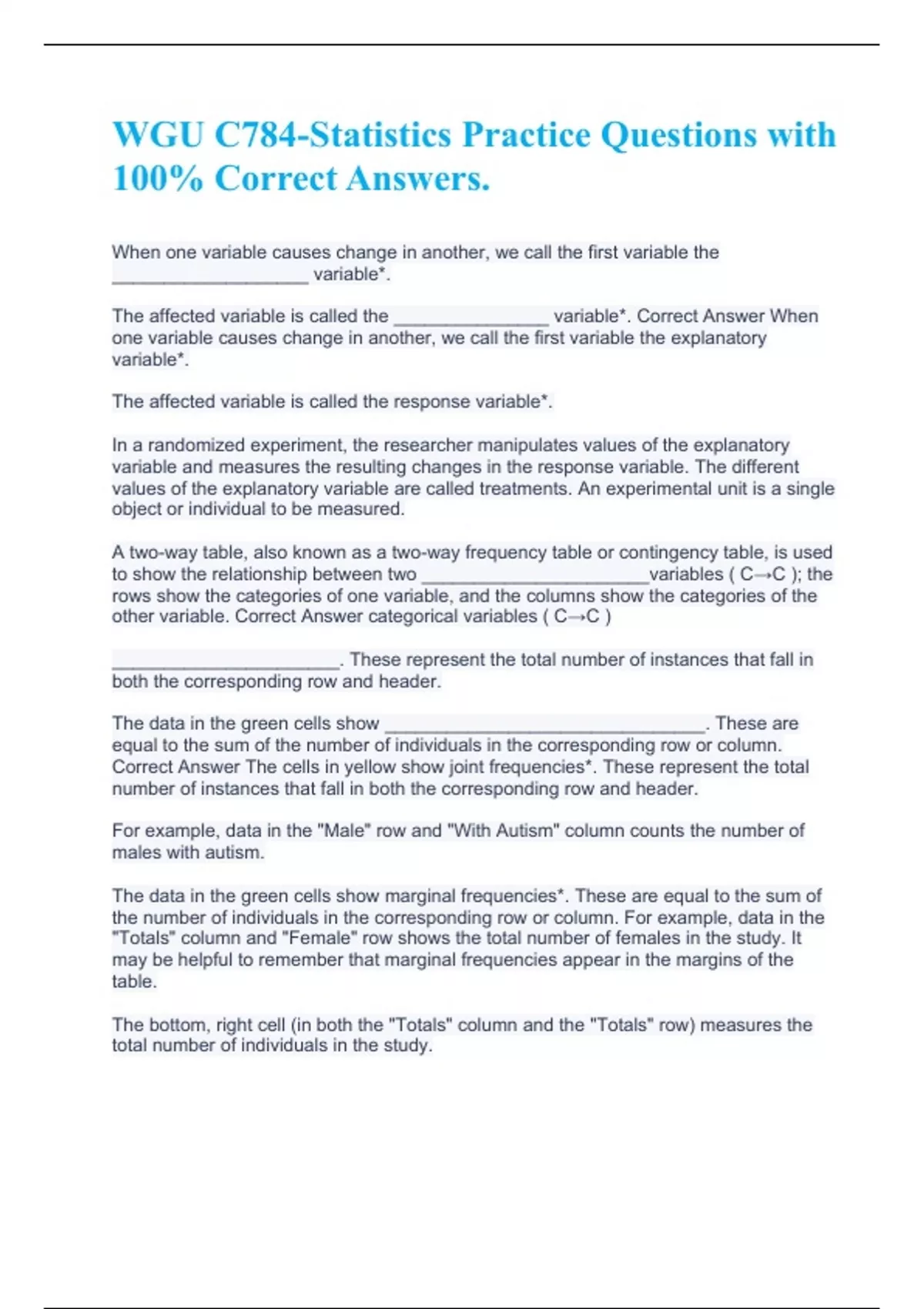 When one variable causes change in another, we call the first variable the ___________________ variable*. The affected variable is called the _______________ variable*. Correct Answer When one variable causes change in another, we call the first variable the explanatory variable*. The affected variable is called the response variable*. In a randomized experiment, the researcher manipulates values of the explanatory variable and measures the resulting changes in the response variable. The different values of the explanatory variable are called treatments. An experimental unit is a single object or individual to be measured. A two-way table, also known as a two-way frequency table or contingency table, is used to show the relationship between two ______________________variables ( C→C ); the rows show the categories of one variable, and the columns show the categories of the other variable. Correct Answer categorical variables ( C→C ) ______________________. These represent the total number of instances that fall in both the corresponding row and header. The data in the green cells show _______________________________. These are equal to the sum of the number of individuals in the corresponding row or column. Correct Answer The cells in yellow show joint frequencies*. These represent the total number of instances that fall in both the corresponding row and header. For example, data in the "Male" row and "With Autism" column counts the number of males with autism. The data in the green cells show marginal frequencies*. These are equal to the sum of the number of individuals in the corresponding row or column. For example, data in the "Totals" column and "Female" row shows the total number of females in the study. It may be helpful to remember that marginal frequencies appear in the margins of the table. The bottom, right cell (in both the "Totals" column and the "Totals" row) measures the total number of individuals in the study.