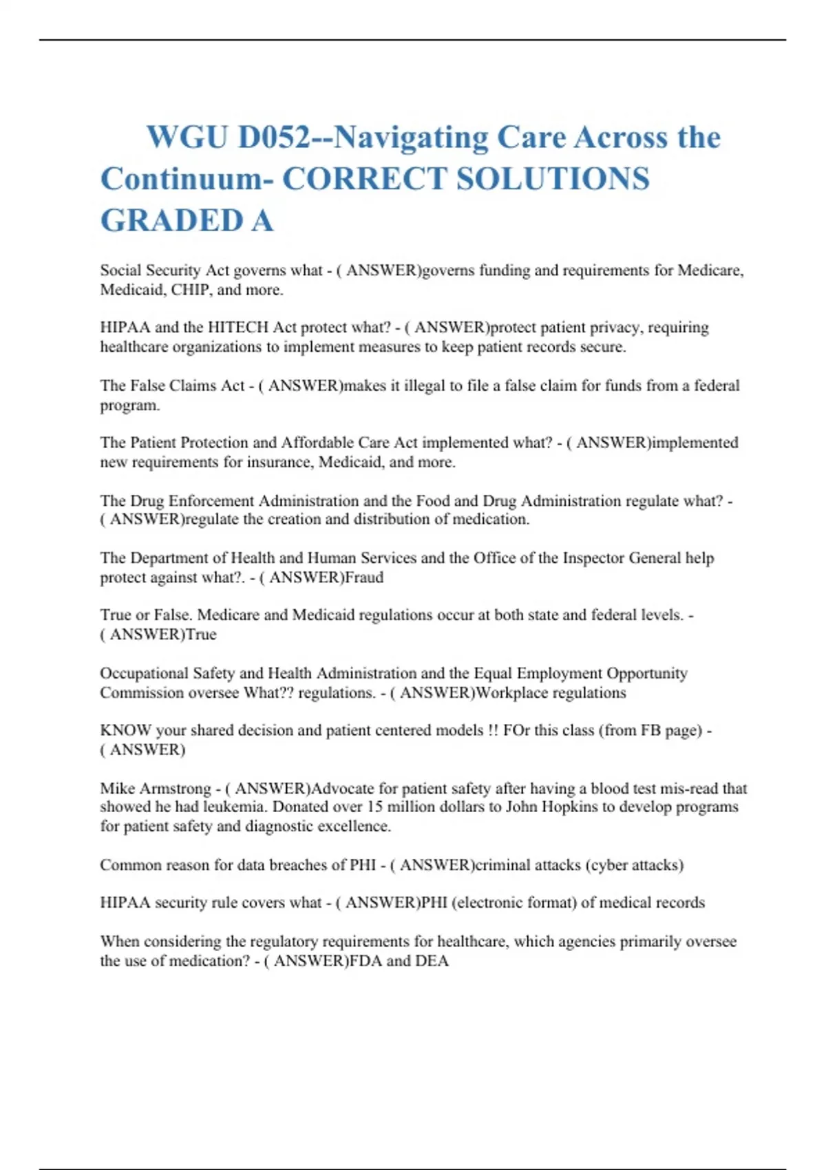 WGU D052--Navigating Care Across the Continuum- CORRECT SOLUTIONS GRADED A