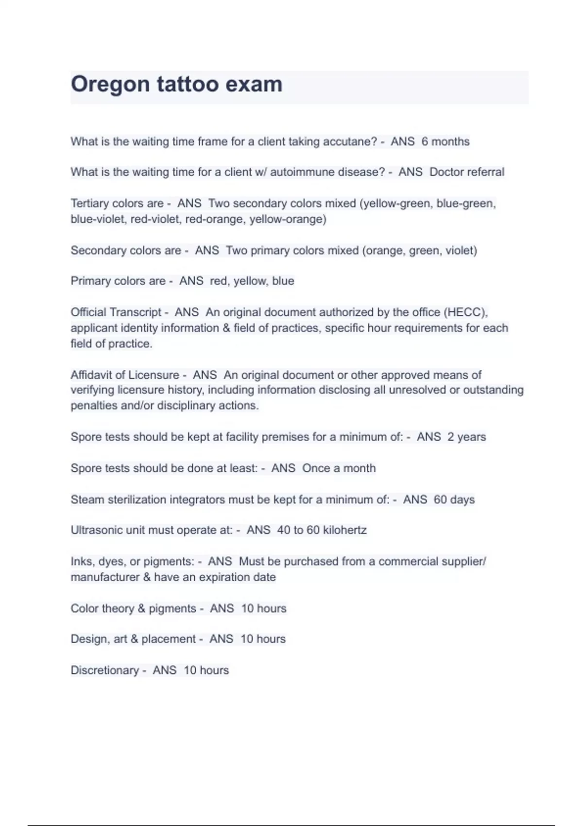 Oregon tattoo exam questions and answers 2023 with complete solutions What is the waiting time frame for a client taking accutane? - ANS 6 months What is the waiting time for a client w/ autoimmune disease? - ANS Doctor referral Tertiary colors are - ANS Two secondary colors mixed (yellow-green, blue-green, blue-violet, red-violet, red-orange, yellow-orange) Secondary colors are - ANS Two primary colors mixed (orange, green, violet) Primary colors are - ANS red, yellow, blue Official Transcript - ANS An original document authorized by the office (HECC), applicant identity information & field of practices, specific hour requirements for each field of practice. Affidavit of Licensure - ANS An original document or other approved means of verifying licensure history, including information disclosing all unresolved or outstanding penalties and/or disciplinary actions. Spore tests should be kept at facility premises for a minimum of: - ANS 2 years Spore tests should be done at least: - ANS Once a month Steam sterilization integrators must be kept for a minimum of: - ANS 60 days Ultrasonic unit must operate at: - ANS 40 to 60 kilohertz Inks, dyes, or pigments: - ANS Must be purchased from a commercial supplier/ manufacturer & have an expiration date Color theory & pigments - ANS 10 hours Design, art & placement - ANS 10 hours Discretionary - ANS 10 hours Needles & needle bars - ANS 20 hours Tattoo machines - ANS 20 hours Equipment/ supplies - ANS 20 hours Skin - ANS 20 hours Client services - ANS 20 Houston Business operations - ANS 20 hours Oregon laws & rules - ANS 20 hours Safety & infection control - ANS 40 hours 150 hours of: - ANS Practical training 210 hours of: - ANS Theory Sharps containers must be what? - ANS Puncture-resistant, leak-proof container that can be closed for handling, storage, transportation, & disposal. Must be labeled with the "biohazard" symbol Office (definition) - ANS Health licensing office Instruments (definition) - ANS Equipment used during tattoo services such as needles & tubes High level disinfectant - ANS A chemical agent, which has demonstrated tuberculocidal activity and is registered with the EPA FDA (definition) - ANS Food & drug administration