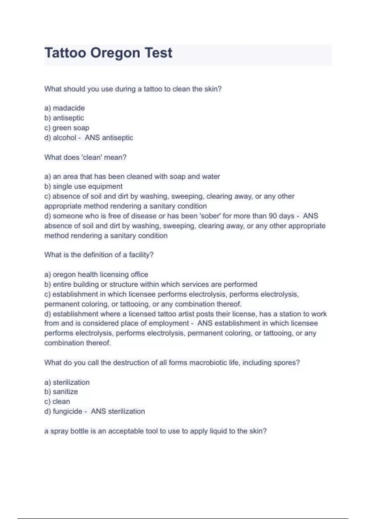 Tattoo Oregon Test COMPLETE QUESTIONS WITH ANSWERS 2022/2023 A+ GRADED What should you use during a tattoo to clean the skin? a) madacide b) antiseptic c) green soap d) alcohol - ANS antiseptic What does 'clean' mean? a) an area that has been cleaned with soap and water b) single use equipment c) absence of soil and dirt by washing, sweeping, clearing away, or any other appropriate method rendering a sanitary condition d) someone who is free of disease or has been 'sober' for more than 90 days - ANS absence of soil and dirt by washing, sweeping, clearing away, or any other appropriate method rendering a sanitary condition What is the definition of a facility? a) oregon health licensing office b) entire building or structure within which services are performed c) establishment in which licensee performs electrolysis, performs electrolysis, permanent coloring, or tattooing, or any combination thereof. d) establishment where a licensed tattoo artist posts their license, has a station to work from and is considered place of employment - ANS establishment in which licensee performs electrolysis, performs electrolysis, permanent coloring, or tattooing, or any combination thereof. What do you call the destruction of all forms macrobiotic life, including spores? a) sterilization b) sanitize c) clean d) fungicide - ANS sterilization a spray bottle is an acceptable tool to use to apply liquid to the skin? true/false - ANS true What is tinea corporis commonly known as? a) dandruff b) athletes foot c) ringworm d) jock itch - ANS Ringworm bar soap is prohibited when washing hands before, during and after a procedure? true/false - ANS true What sinks do not qualify as a water source for the facility premises? a) employee hand washing sinks b) bathroom sinks c) sinks with less than 30 lbs of pressure d) sinks with more than 30 lbs of pressure - ANS b) bathroom sinks What is the most important procedure for prevention of all infections, including HIV? a) accurate aftercare and pre-service sheet b) waivers c) single-use tubes and needles d) good hand-washing after glove removal and between each client - ANS good hand-washing after glove removal and between each client What should I do if I notice a tear in my gloves? a) Take gloves off, put new gloves on. b) Take gloves off, use an approved hand sanitizer, put new gloves on c) Take gloves off, wash hands, put new gloves on d) Nothing as long as I did not break skin - ANS c) Take gloves off, wash hands, put new gloves on Whom of the following may you tattoo? Someone who.... . .