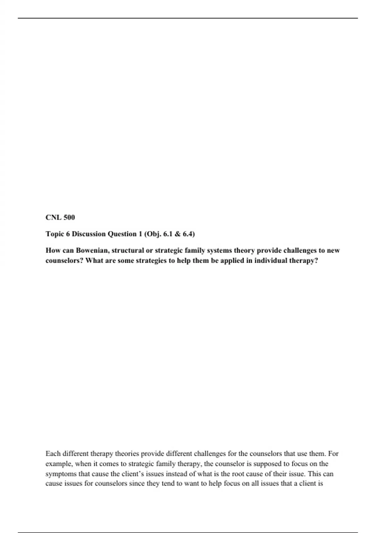 CNL 500 (Theories and Models of Counseling) Topic 6 Discussion Question 1 (Obj. 6.1, and 6.4) Description: How can Bowenian, structural or strategic family systems theory provide challenges to new counselors? What are some strategies to help them be applied in individual therapy?