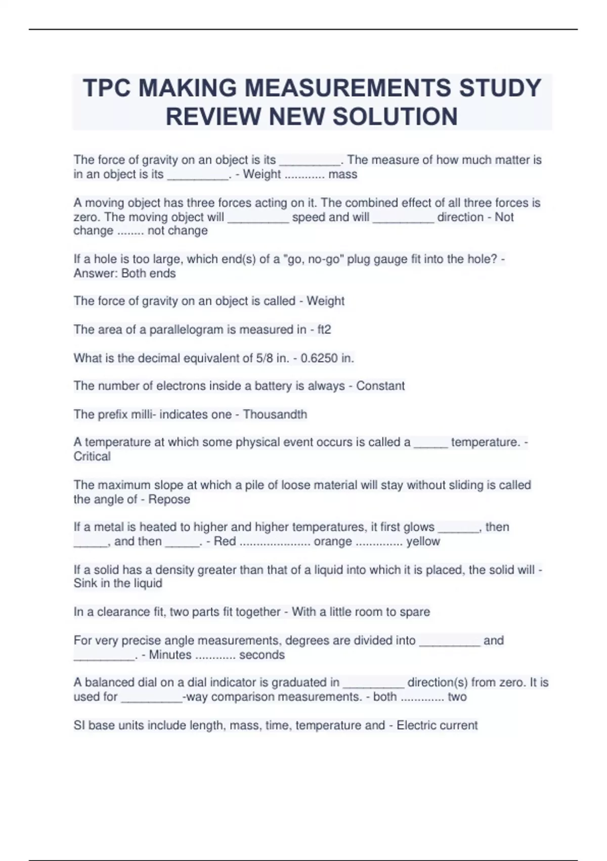 TPC MAKING MEASUREMENTS STUDY REVIEW NEW SOLUTION The force of gravity on an object is its _________. The measure of how much matter is in an object is its _________. A moving object has three forces acting on it. The combined effect of all three forces is zero. The moving object will _________ speed and will _________ direction If a hole is too large, which end(s) of a "go, no-go" plug gauge fit into the hole? The force of gravity on an object is called The area of a parallelogram is measured in