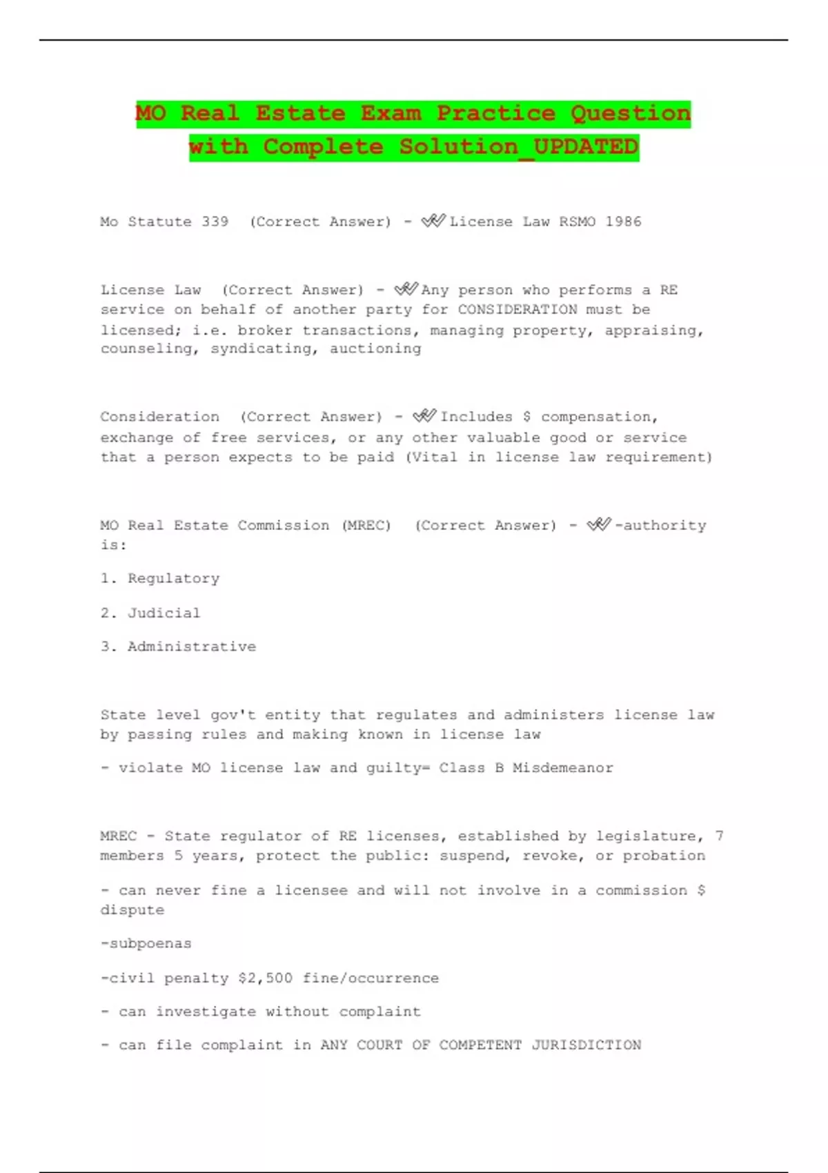 MO Real Estate Exam Practice Question with Complete Solution_UPDATED