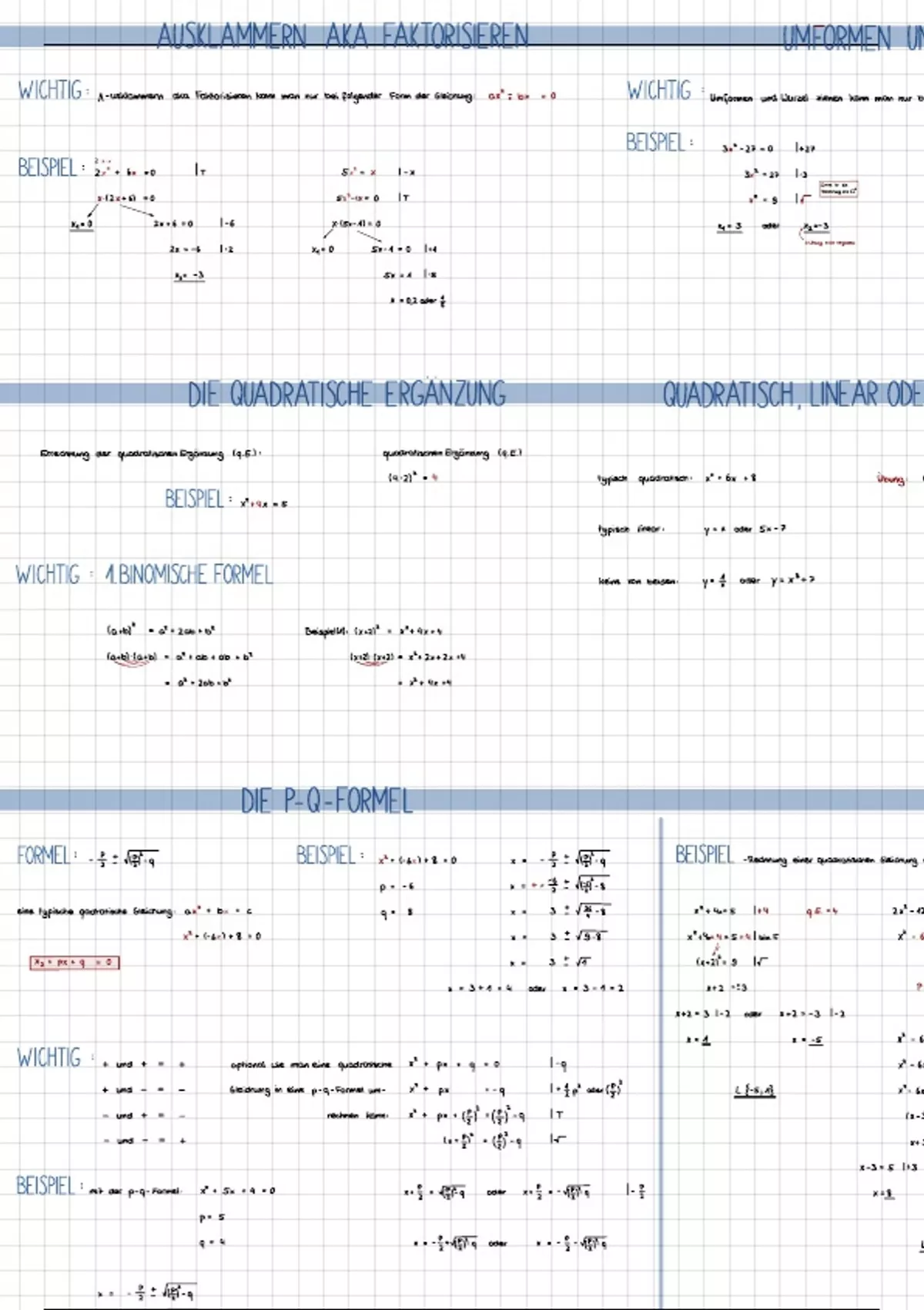 Hi. Hier findest du eine Zusammenfassung der Themen: p-q-Formle, ausklammern, quadratische Ergänzung, quadratische und lineare Funktionen/Gleichungen mit vielen Beispielen und Rechnungen.