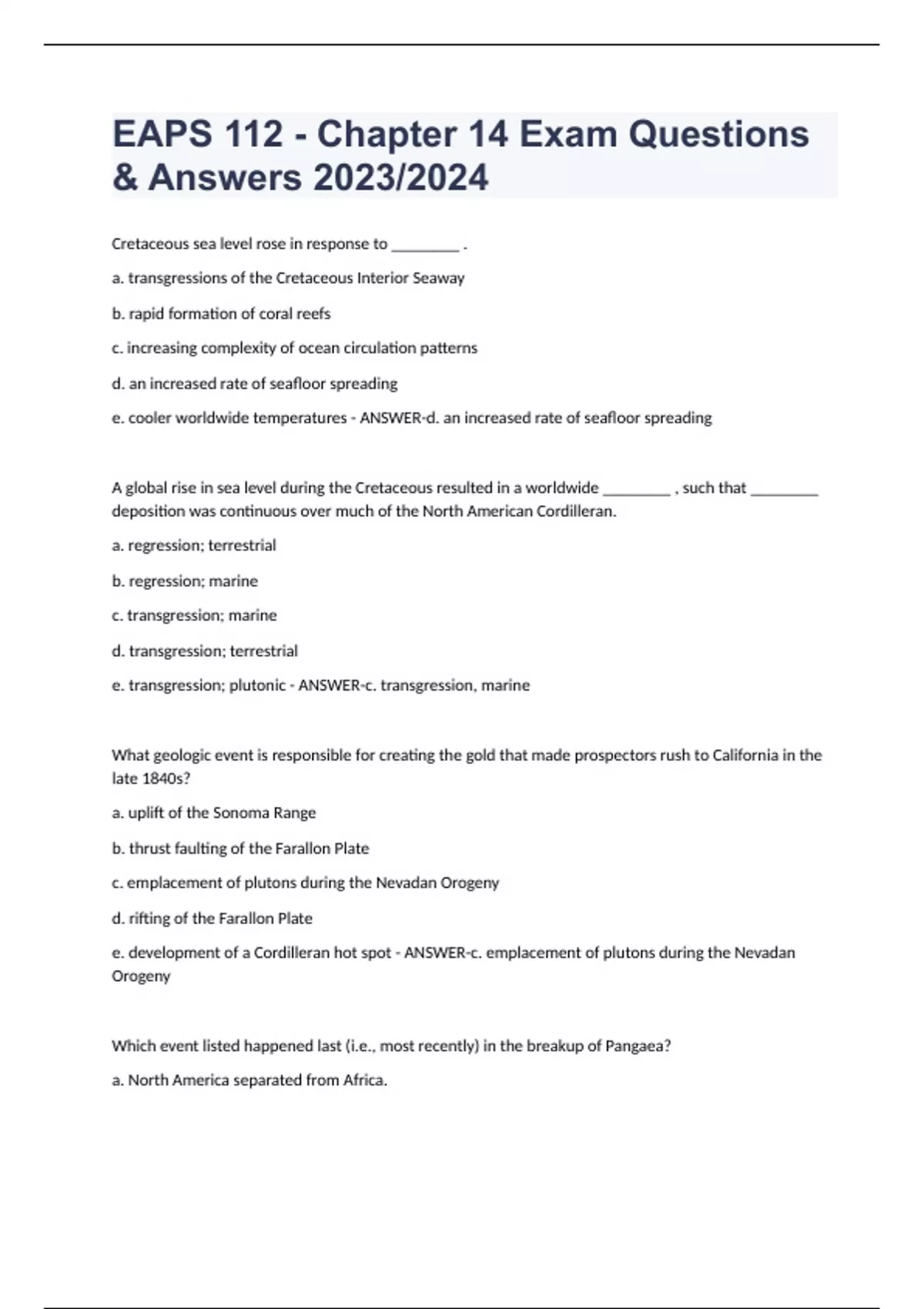 e. Antarctica and Africa broke apart from Gondwana. - ANSWER-b. Europe and Africa began to converge