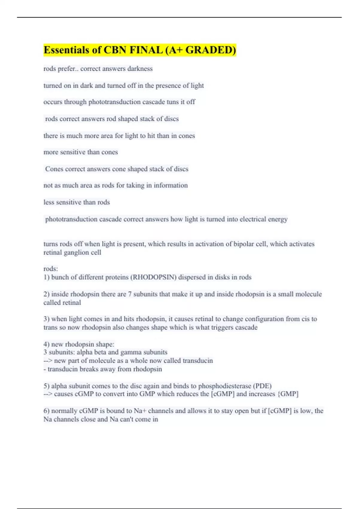 rods prefer.. correct answers darkness turned on in dark and turned off in the presence of light occurs through phototransduction cascade tuns it off rods correct answers rod shaped stack of discs there is much more area for light to hit than in cones more sensitive than cones Cones correct answers cone shaped stack of discs not as much area as rods for taking in information less sensitive than rods phototransduction cascade correct answers how light is turned into electrical energy turns rods off when light is present, which results in activation of bipolar cell, which activates retinal ganglion cell rods: 1) bunch of different proteins (RHODOPSIN) dispersed in disks in rods 2) inside rhodopsin there are 7 subunits that make it up and inside rhodopsin is a small molecule called retinal 3) when light comes in and hits rhodopsin, it causes retinal to change configuration from cis to trans so now rhodopsin also changes shape which is what triggers cascade 4) new rhodopsin shape: 3 subunits: alpha beta and gamma subunits -- new part of molecule as a whole now called transducin - transducin breaks away from rhodopsin 5) alpha subunit comes to the disc again and binds to phosphodiesterase (PDE) -- causes cGMP to convert into GMP which reduces the [cGMP] and increases {GMP] 6) normally cGMP is bound to Na+ channels and allows it to stay open but if [cGMP] is low, the Na channels close and Na can't come in