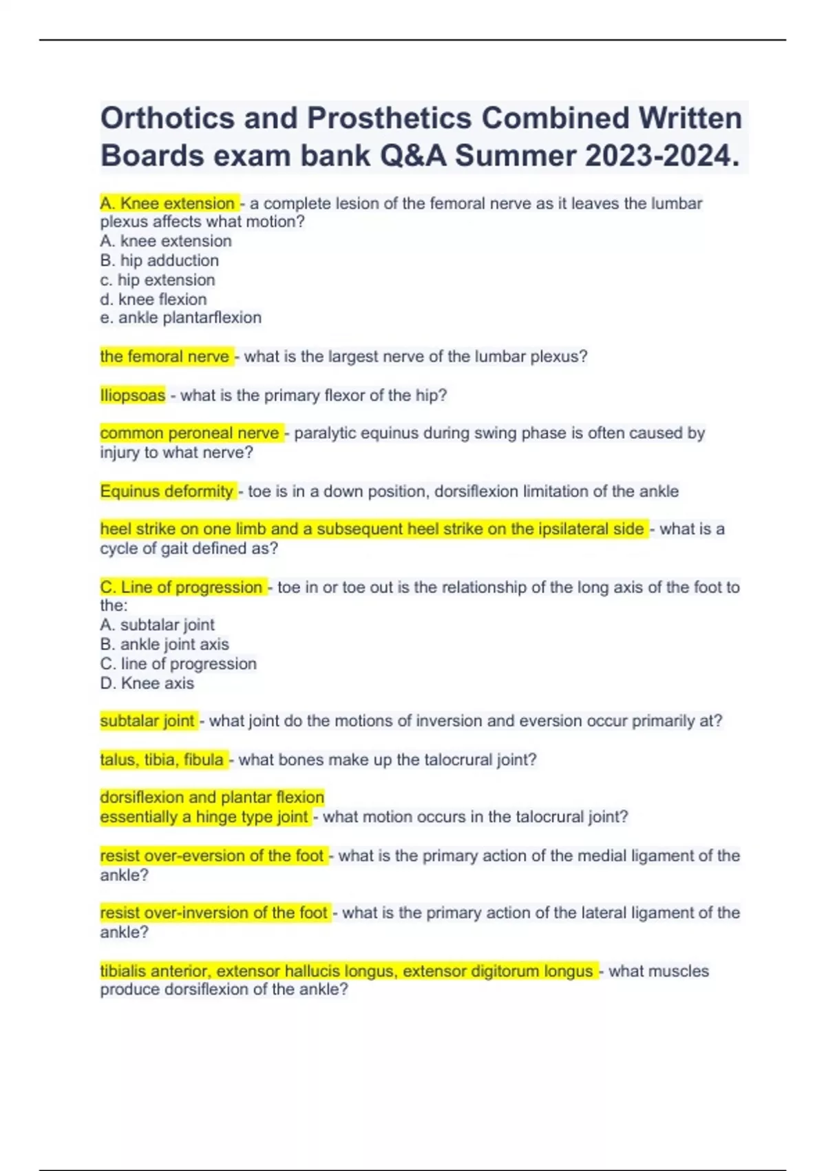 Orthotics and Prosthetics Combined Written Boards exam bank Q&A Summer .