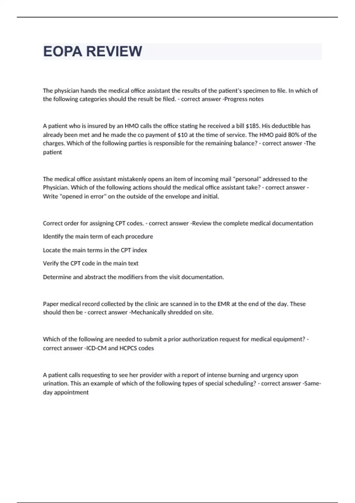 The physician hands the medical office assistant the results of the patient's specimen to file. In which of the following categories should the result be filed. Progress notes A patient who is insured by an HMO calls the office stating he received a bill $185. His deductible has already been met and he made the co payment of $10 at the time of service. The HMO paid 80% of the charges. Which of the following parties is responsible for the remaining balance? The patient The medical office assistant mistakenly opens an item of incoming mail "personal" addressed to the Physician. Which of the following actions should the medical office assistant take? Write "opened in error" on the outside of the envelope and initial. Correct order for assigning CPT codes. Review the complete medical documentation Identify the main term of each procedure Locate the main terms in the CPT index Verify the CPT code in the main text Determine and abstract the modifiers from the visit documentation. Paper medical record collected by the clinic are scanned in to the EMR at the end of the day. These should then be Mechanically shredded on site. Which of the following are needed to submit a prior authorization request for medical equipment? ICD-CM and HCPCS codes A patient calls requesting to see her provider with a report of intense burning and urgency upon urination. This an example of which of the following types of special scheduling? Same-day appointment