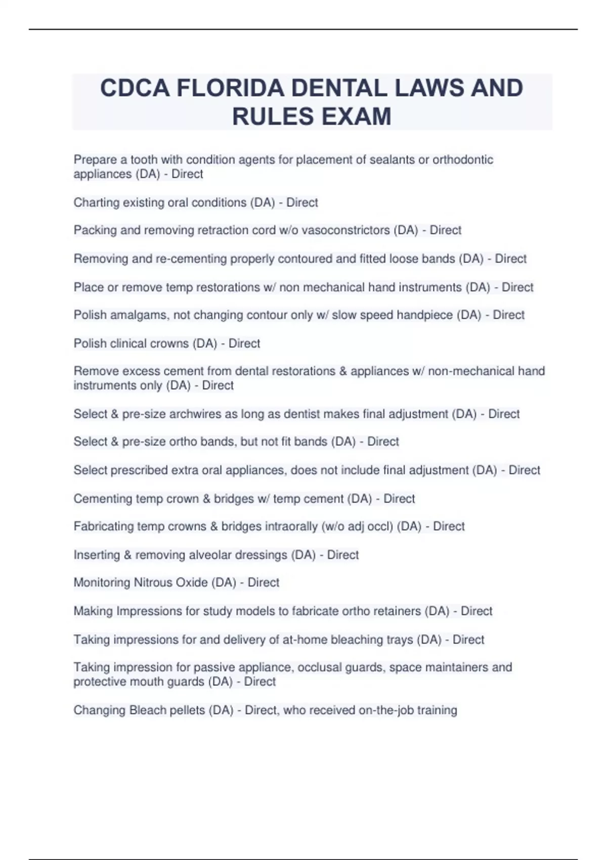 CDCA FLORIDA DENTAL LAWS AND RULES EXAM Prepare a tooth with condition agents for placement of sealants or orthodontic appliances (DA) - Direct Charting existing oral conditions (DA) - Direct Packing and removing retraction cord w/o vasoconstrictors (DA)