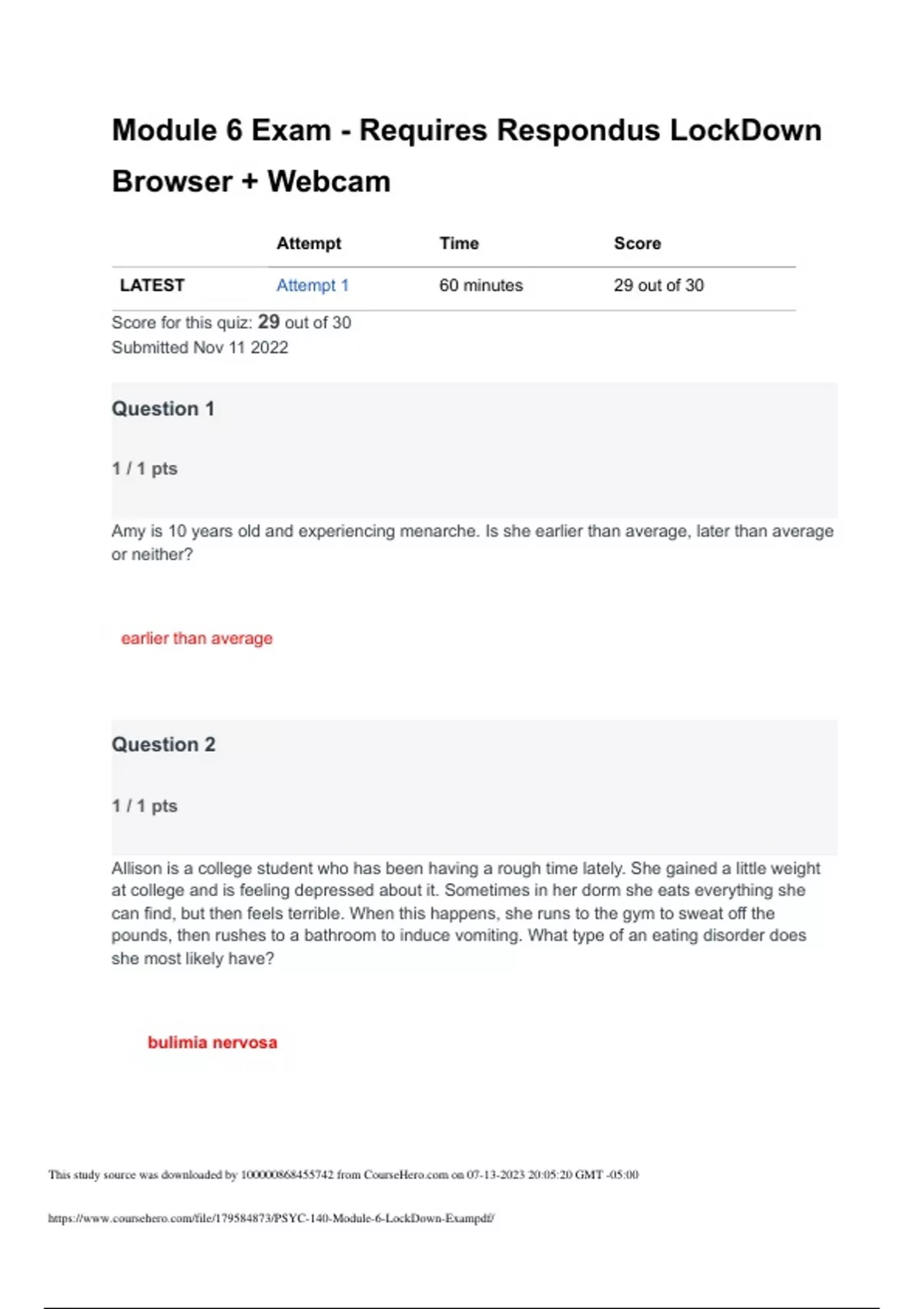 Module 6 Exam - Requires Respondus LockDown Browser + Webcam Attempt Time Score LATEST Attempt 1 60 minutes 29 out of 30 Score for this quiz: 29 out of 30 Submitted Nov 11 2022 Question 1 1 / 1 pts Amy is 10 years old and experiencing menarche. Is she earlier than average, later than average or neither?! earlier than average Question 2 1 / 1 pts Allison is a college student who has been having a rough time lately. She gained a little weight at college and is feeling depressed about it. Sometimes in her dorm she eats everything she can find, but then feels terrible. When this happens, she runs to the gym to sweat off the pounds, then rushes to a bathroom to induce vomiting. What type of an eating disorder does she most likely have? bulimia nervosa This study source was downloaded by from CourseH on :05:20 GMT -05:00 Question 3 1 / 1 pts When does adolescence end? Your Answer: Adolescence ends after the growth spurt/puberty. This determination differs in different countaries, due to different social constructs in society/religions. Actions and physical and cognitive development When the individual achieves adult status. Question 4 0 / 1 pts Mia is a junior in high school and has not yet had her first period. Her seventeenth birthday is in three months. Based on this information, answer the following questions: Is Mia more likely or less likely to have a good body image compared to girls who experienced early menarche? more likely This study source was downloaded by from CourseH on :05:20 GMT -05:00 Question 5 1 / 1 pts According to experts, adolescents’ increase in sarcastic humor may be tied to what increased cognitive ability during adolescence? Be specific. Your Answer: The adolescent's ability to understand the meaning behind sarcasm is indicative of the advanced ability to engage in complex or multidimensional thinking, opposed to the cognitive development of children. abstract thought Question 6 1 / 1 pts True or false? A teen who is struggling with her sexual orientation is at a higher risk for a suicide attempt.Correct! True