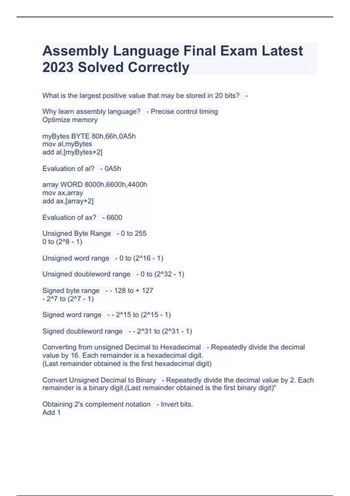Assembly Language Final Exam Latest 2023 Solved Correctly