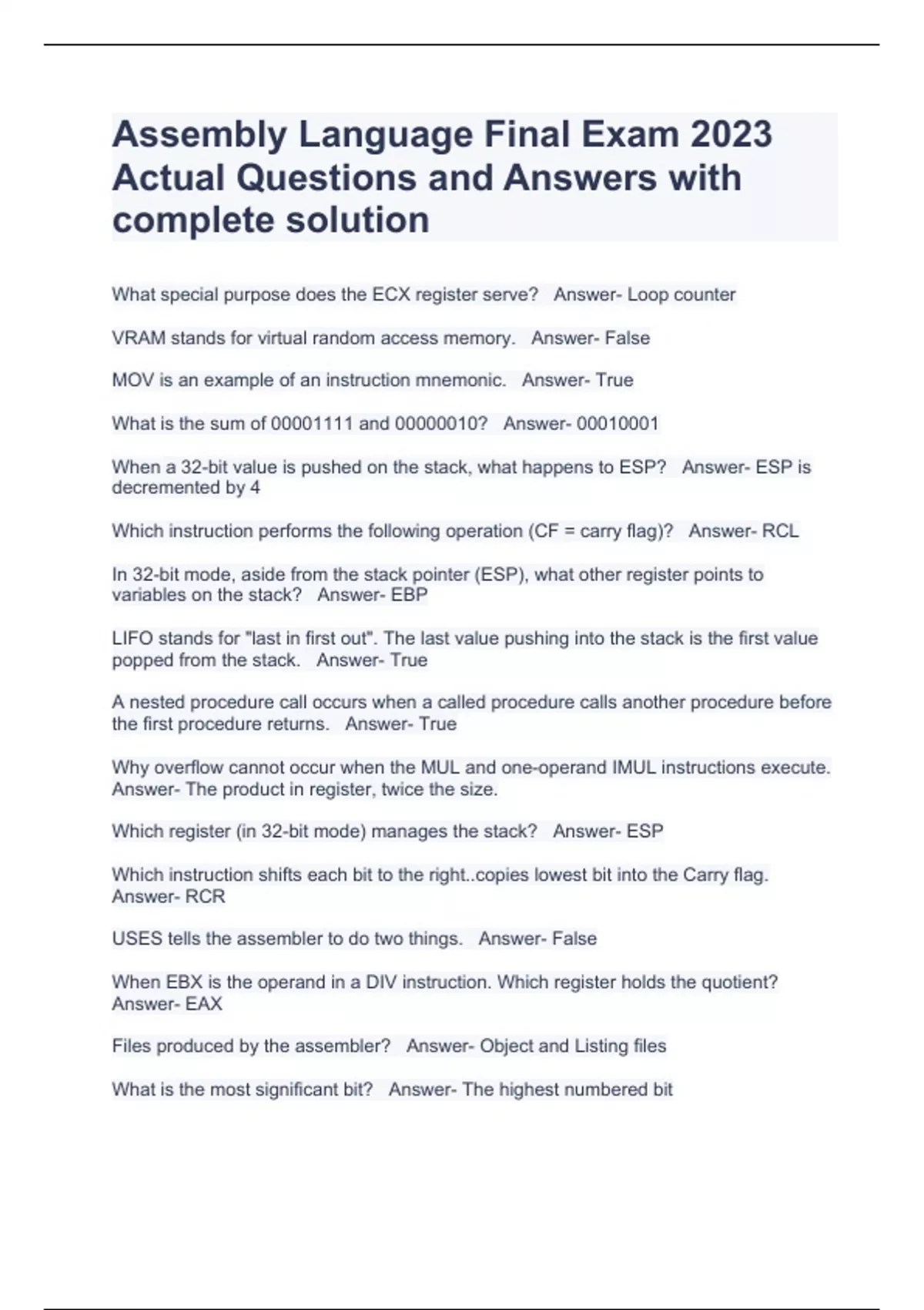 Assembly Language Final Exam 2023 Actual Questions and Answers with complete solution