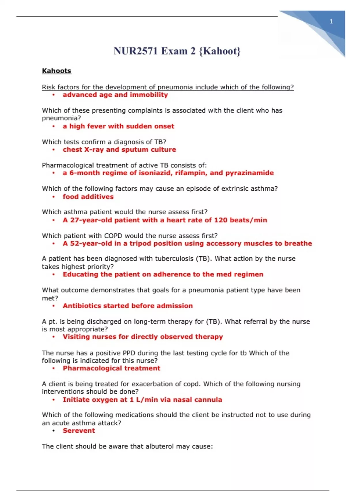 Risk factors for the development of pneumonia include which of the following? • advanced age and immobility Which of these presenting complaints is associated with the client who has pneumonia? • a high fever with sudden onset Which tests confirm a diagnosis of TB? • chest X-ray and sputum culture Pharmacological treatment of active TB consists of: • a 6-month regime of isoniazid, rifampin, and pyrazinamide Which of the following factors may cause an episode of extrinsic asthma? • food additives Which asthma patient would the nurse assess first?