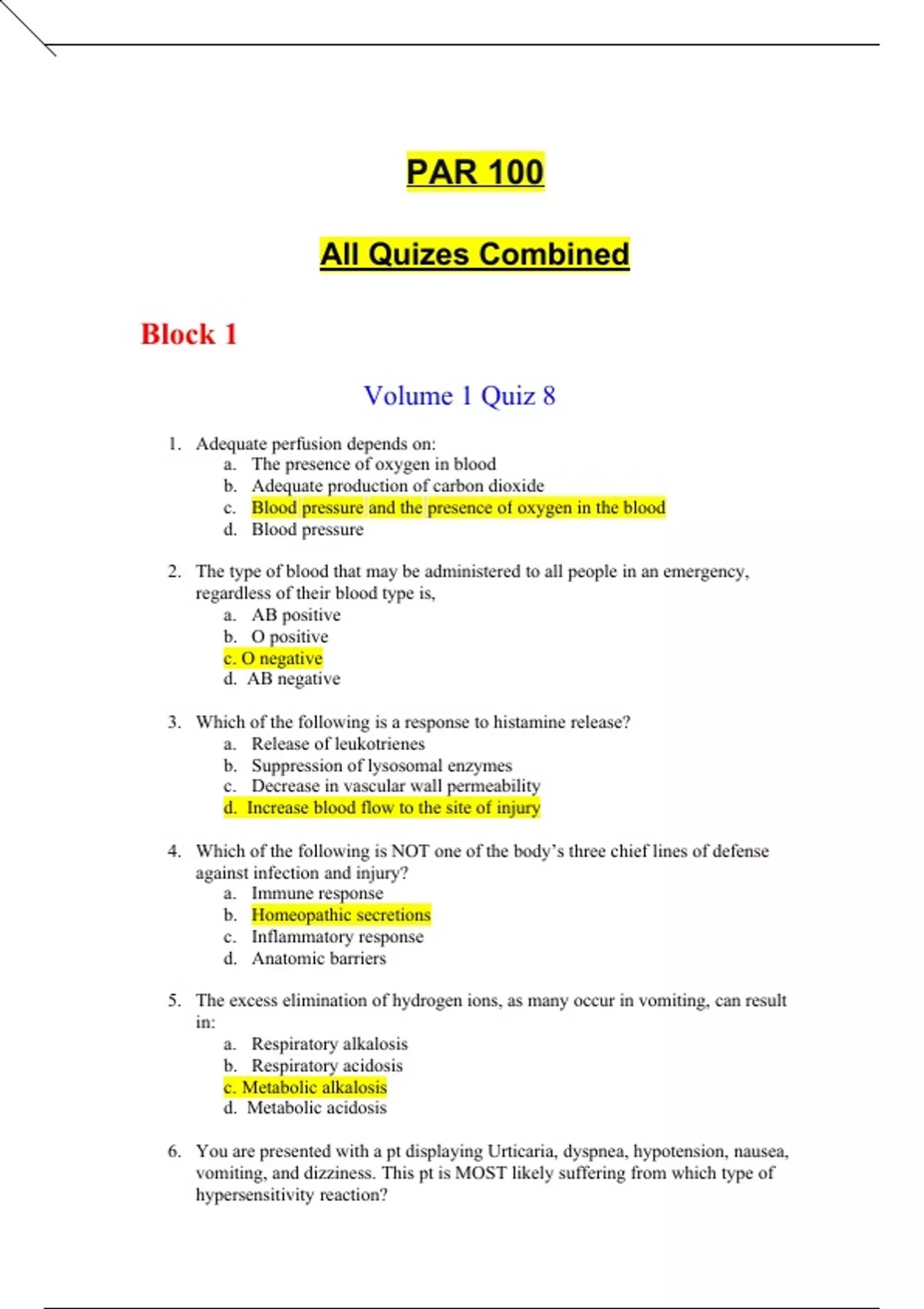 PAR 100 All Quizes Combined Block 1 Volume 1 Quiz 8 Adequate perfusion depends on: The presence of oxygen in blood Adequate production of carbon dioxide Blood pressure and the presence of oxygen in the blood Blood pressure The type of blood that may be administered to all people in an emergency, regardless of their blood type is, AB positive O positive c. O negative d. AB negative Which of the following is a response to histamine release? Release of leukotrienes Suppression of lysosomal enzymes Decrease in vascular wall permeability d. Increase blood flow to the site of injury Which of the following is NOT one of the body’s three chief lines of defense against infection and injury? Immune response Homeopathic secretions Inflammatory response Anatomic barriers The excess elimination of hydrogen ions, as many occur in vomiting, can result in: Respiratory alkalosis Respiratory acidosis c. Metabolic alkalosis d. Metabolic acidosis You are presented with a pt displaying Urticaria, dyspnea, hypotension, nausea, vomiting, and dizziness. This pt is MOST likely suffering from which type of hypersensitivity reaction? Type 1 Type 2 Type 3 Type 4 The spleen is a part of which organ system Digestive b. Lymphatic Endocrine Cardiovascular Which of the following processes is used when glucose enters a cell? Osmosis Facilitated diffusion Diffusion Active Transport The general term for the storing and creating energy in the body is? Homeostasis Negative Feedback Granulation d. Metabolism The process that produces an increase in cell size as a result of increasing workload is? Hypertrophy Atrophy Hyperplasia Metaplasia B lymphocytes are primarily responsible for: Neutralizing antibodies Producing antigens c. Producing antibodies d. Directly attacking antigens A pt was shot in the abdomen and has a resultant massive hemorrhage and hypoperfusion, IV therapy would help treat hypoperfusion by? Slowing the rate of hemorrhage Increasing the heart rate Replacing blood constituents d. Increasing preload Which of the following terms can be defined as the activities of the body that allow the maintenance of physiological stability Homeostasis Metabolism Dysplasia Natural stability The amount of blood that returns to the heart during diastole Cardiac output b. Preload Afterload Myocardial capacity Most of the formed elements of the blood are a. Erythrocytes Stem cells Leukocytes Thrombocytes The sagittal plane separates right and left portions of the body True or Flase? a. True b. False The largest percentage of water in body is located in the? Interstitial fluid Extracellular fluid Extrastitial fluid d. Intracellular fluid Blood pressure is represented by Preload - afterload Cardiac output x peripheral vascular resistance Stroke volume x heart rate Cardiac contractile force – peripheral vascular resistance Septic shock is precipitated by An overwhelming infection Exposure to an antigen Poisoning MODS Solution having a comparatively higher concentration of solutes is said to be Osmotic Hypotonic c. Hypertonic d. Isotonic Positively charged atom Anion b. Cation c. Bicarbinate