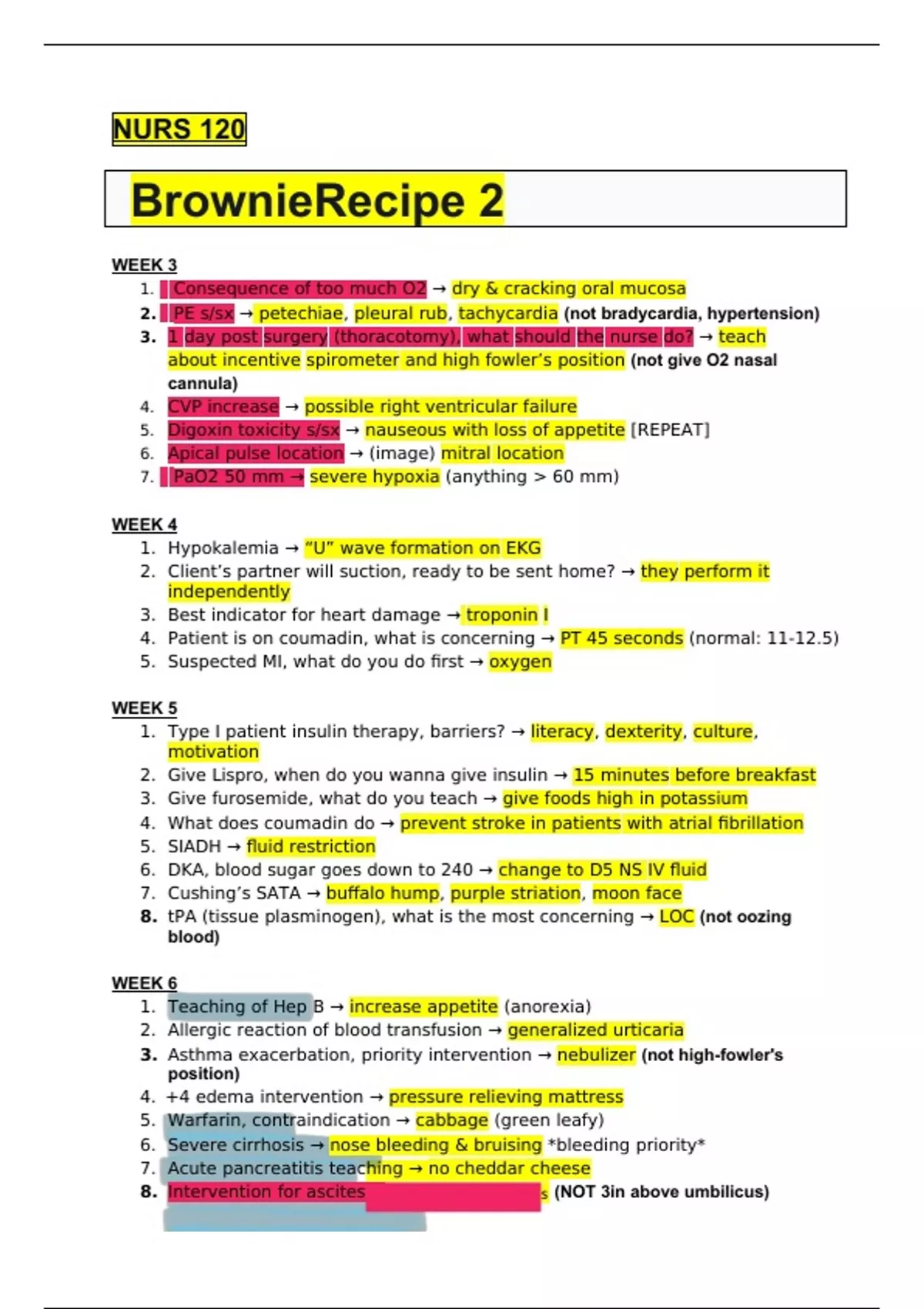 NURS 120 BrownieRecipe 2 WEEK 3 1. Consequence of too much O2 → dry & cracking oral mucosa 2. PE s/sx → petechiae, pleural rub, tachycardia (not bradycardia, hypertension) 3. 1 day post surgery (thoracotomy), what should the nurse do? → teach about incentive spirometer and high fowler’s position (not give O2 nasal cannula) 4. CVP increase → possible right ventricular failure 5. Digoxin toxicity s/sx → nauseous with loss of appetite [REPEAT] 6. Apical pulse location → (image) mitral location 7. PaO2 50 mm → severe hypoxia (anything 60 mm) WEEK 4 1. Hypokalemia → “U” wave formation on EKG 2. Client’s partner will suction, ready to be sent home? → they perform it independently 3. Best indicator for heart damage → troponin I 4. Patient is on coumadin, what is concerning → PT 45 seconds (normal: 11-12.5) 5. Suspected MI, what do you do first → oxygen WEEK 5 1. Type I patient insulin therapy, barriers? → literacy, dexterity, culture, motivation 2. Give Lispro, when do you wanna give insulin → 15 minutes before breakfast 3. Give furosemide, what do you teach → give foods high in potassium 4. What does coumadin do → prevent stroke in patients with atrial fibrillation 5. SIADH → fluid restriction 6. DKA, blood sugar goes down to 240 → change to D5 NS IV fluid 7. Cushing’s SATA → buffalo hump, purple striation, moon face 8. tPA (tissue plasminogen), what is the most concerning → LOC (not oozing blood) WEEK 6 1. Teaching of Hep B → increase appetite (anorexia) 2. Allergic reaction of blood transfusion → generalized urticaria 3. Asthma exacerbation, priority intervention → nebulizer (not high-fowler's position) 4. +4 edema intervention → pressure relieving mattress 5. Warfarin, contraindication → cabbage (green leafy) 6. Severe cirrhosis → nose bleeding & bruising *bleeding priority* 7. Acute pancreatitis teaching → no cheddar cheese 8. Intervention for ascites → (NOT 3in above umbilicus) 9. Cirrhosis, further teaching → “I can eat anything I want” 10. Acute pancreatitis, after pain med → keep them NPO 11. TPN at home teaching (SATA) → keep refrigerated, start D10 if feeding is finished, keep infusion rate if behind on feeding (3) 12. Patient is falling asleep as nurse is talking to them → increased ammonia levels 13. Cholecystitis (SATA) → back rub, incisional splinting, identify pain level, change client position (4) WEEK 7 1. Spinal cord injury, what will occur? → flaccid paralysis 2. What contributes to ICP → sodium 110 (hyponatremia) *always think sodium!* 3. Hep A, early indication → anorexia 4. Acute pancreatitis, where is the pain → epigastric radiating to back 5. What should be reported → ICP of 19 6. Left HH, teaching → put tray & items on patient’s right side 7. Cane teaching with AP → move cane first before legs 8. Stroke teaching → put the patient semi fowlers to facilitate swallowing 9. Associated with embolic stroke → chronic a fib 10. L1, what should you do? → give anticoagulants (they are paralyized → not active ROM exercises) 11. TIA where will you monitor, symptoms go away → go to neurotele & monitor 12. Embolic stroke → it travels 13. Most concern to nurse → unresponsive with arousal 14. ICP sata → headache, slurred speech, eye changes, disorientation 15. Trauma, s/sx hypovolemia → increased HR (tachycardia)