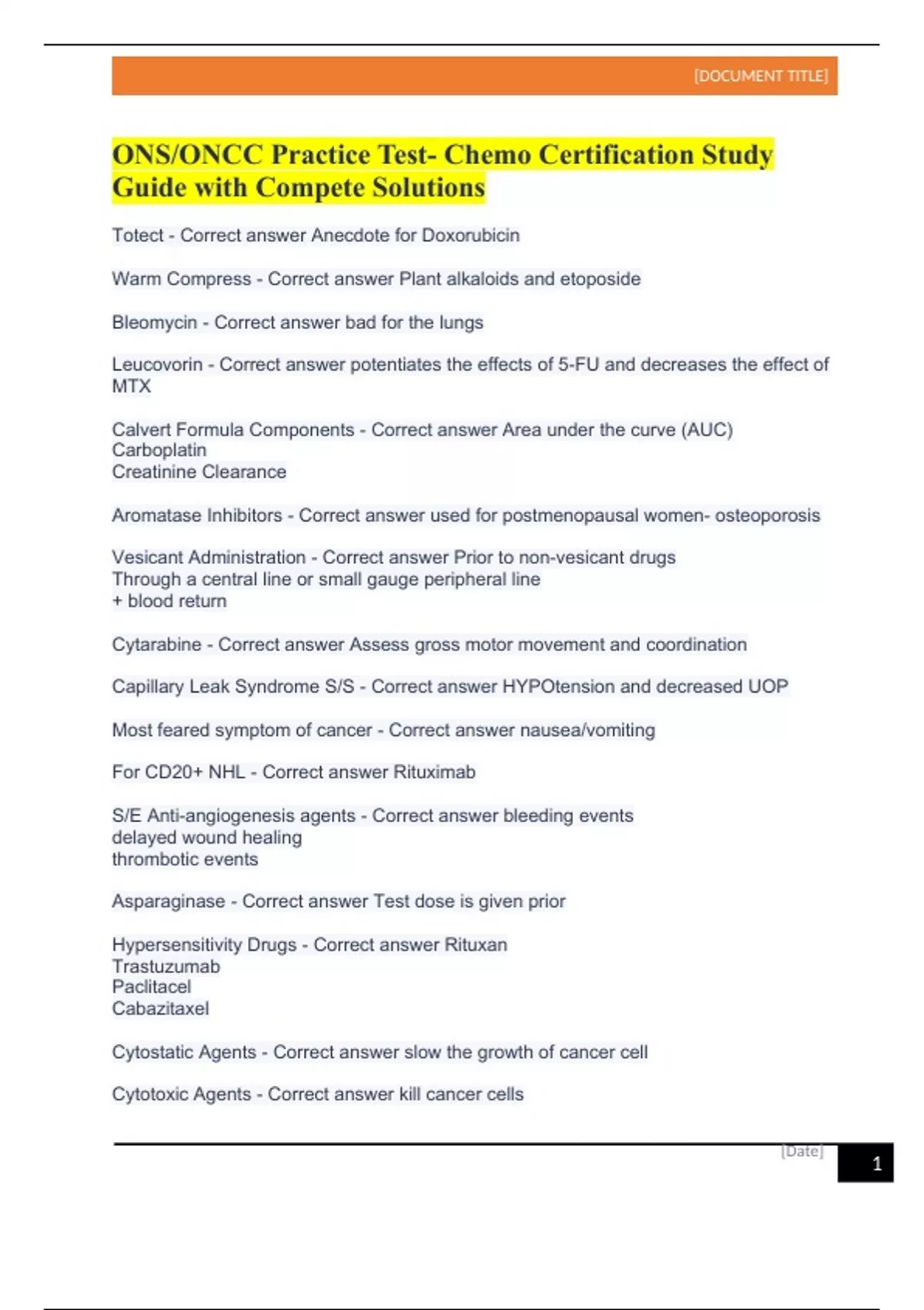 ONS/ONCC Practice Test- Chemo Certification Study Guide with Compete Solutions ONS/ONCC Practice Test- Chemo Certification Study Guide with Compete Solutions