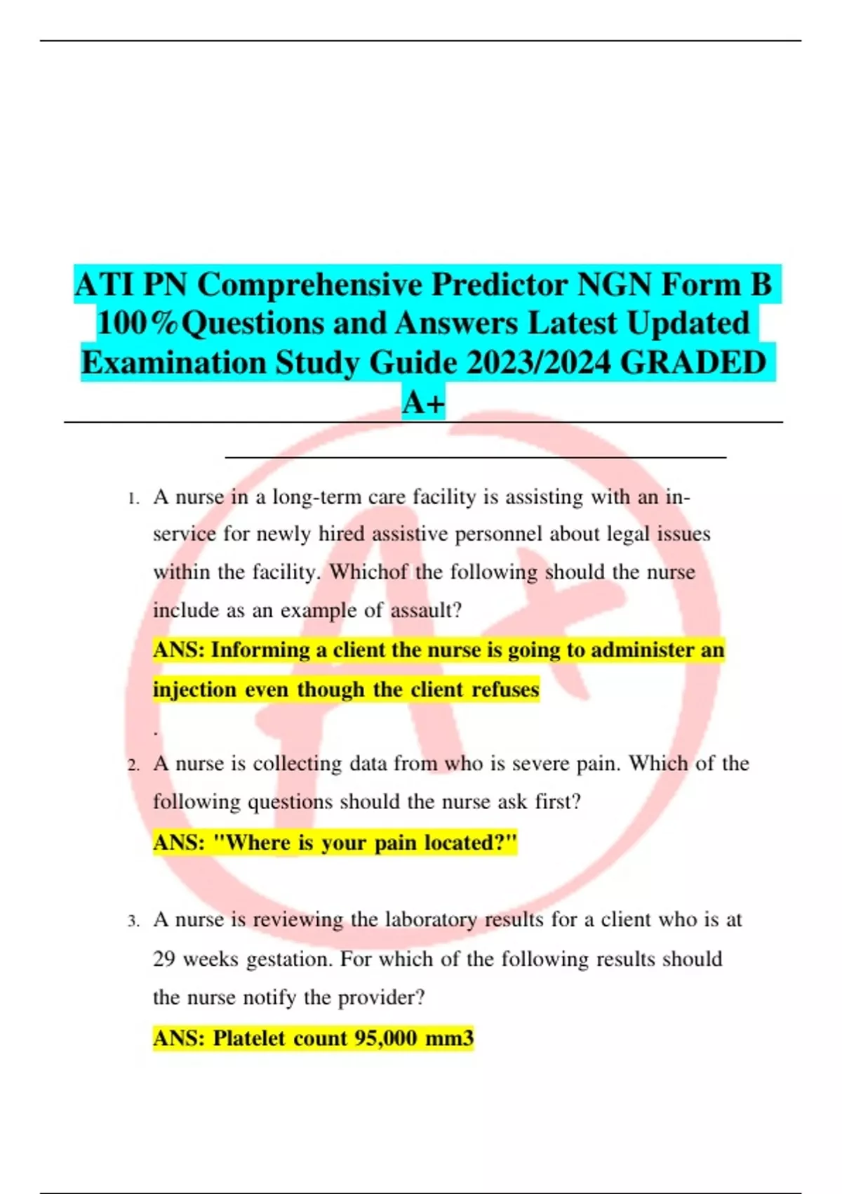 ATI PN Comprehensive Predictor NGN Form B 100% Questions and Answers Latest Updated Examination Study Guide 2023/2024 GRADED A+ 1. A nurse in a long-term care facility is assisting with an in- service for newly hired assistive personnel about legal issues within the facility. WhichofIthe following should the nurse include as an example ofIassault? ANS: Informing a client the nurse is going to administer an injection even though the client refuses . 2. A nurse is collecting data from who is severe pain. Which of the following questions should the nurse ask first? ANS: "Where is your pain located?" 3. A nurse is reviewing the laboratory results for a client who is at 29 weeks gestation. For which of the following results should the nurse notify the provider? ANS: Platelet count 95,000 mm3 4. A nurse is performing a dressing change for a client who had abdominal surgery 5 day s ago. The nurse notes organs protruding from the incision. Which of the following act ions should the nurse take? ANS: Cover the exposed area with sterile, saline-soaked dressings. 5. A nurse is speaking with the adult daughter ofIa client who has Alzheimer's disease. T he daughter states, "I love my dad, but caring for him is wearing me out." Which of th e following response should the nurse make? ANS: "Let's discuss how caring for your father is afollowingecting your health. 6. A nurse is contributing to the plan ofIcare for a care for a client who has chest tube co nnected to a closed drainage system. Which ofIthe following actions should the nurse i nclude in the plan of care? ANS: Maintain the drainage system below the level ofIthe client's chest. 7. A nurse in an acute mental health facility is caring for a client who has borderline personality disorder and reports. "I am going to kill my girlfriend when I get out ofIhere." Which ofIthe following actions should the nurse take? ANS: Notify the client's care team of the threats against the partner 8. A nurse is admitting a client who is at high risk for suicide. Which ofIthe following actions is the nurse's priority? ANS: Search the client's personal belongings 9. A nurse is caring for a client who is 1 day postoperative and is unable to ambulate. W hich ofIthe following actions should the nurse take to promote the client's venous return? ANS: Maintain the sequential compression device.