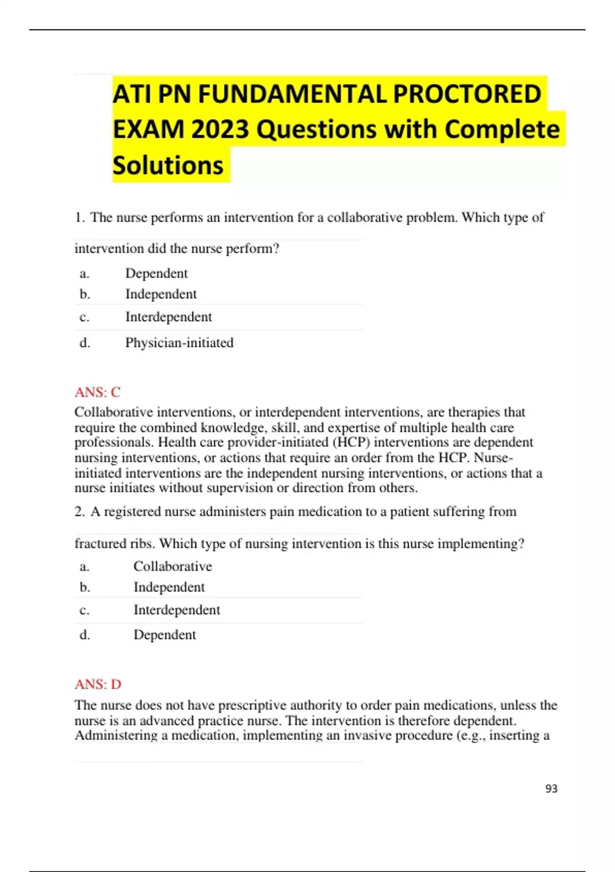 ATI PN FUNDAMENTAL PROCTORED EXAM 2023 Questions with Complete Solutions 1. The nurse performs an intervention for a collaborative problem. Which type of intervention did the nurse perform? a. Dependent b. Independent c. Interdependent d. Physician-initiated ANS: C Collaborative interventions, or interdependent interventions, are therapies that require the combined knowledge, skill, and expertise of multiple health care professionals. Health care provider-initiated (HCP) interventions are dependent nursing interventions, or actions that require an order from the HCP. Nurse- initiated interventions are the independent nursing interventions, or actions that a nurse initiates without supervision or direction from others. 2. A registered nurse administers pain medication to a patient suffering from fractured ribs. Which type of nursing intervention is this nurse implementing? a. Collaborative b. Independent c. Interdependent d. Dependent ANS: D The nurse does not have prescriptive authority to order pain medications, unless the nurse is an advanced practice nurse. The intervention is therefore dependent. Administering a medication, implementing an invasive procedure (e.g., inserting a 93 Foley catheter, starting an intravenous [IV] infusion), and preparing a patient for diagnostic tests are examples of health care provider-initiated interventions. A collaborative, or an interdependent, intervention involves therapies that require combined knowledge, skill, and expertise from multiple health care professionals. Nurse-initiated interventions are the independent nursing interventions, or actions that a nurse initiates without supervision or direction from others. 3. Which action indicates the nurse is using a PICOT question to improve care for a patient? a. Practices nursing based on the evidence presented in court b. Implements interventions based on scientific research c. Uses standardized care plans for all patients. d. Plans care based on tradition ANS: B The best answer is implementing interventions based on scientific research. Using results of a literature search to a PICOT question can help a nurse decide which interventions to use. Practicing based on evidence presented in court is incorrect. Practice is based on current research. Using standardized care plans may be one example of evidence-based practice, but it is not used on all patients. The nurse must be careful in using standardized care plans to ensure that each patient’s plan of care is still individualized. Planning care based on tradition is incorrect because nursing care should be based on current research.