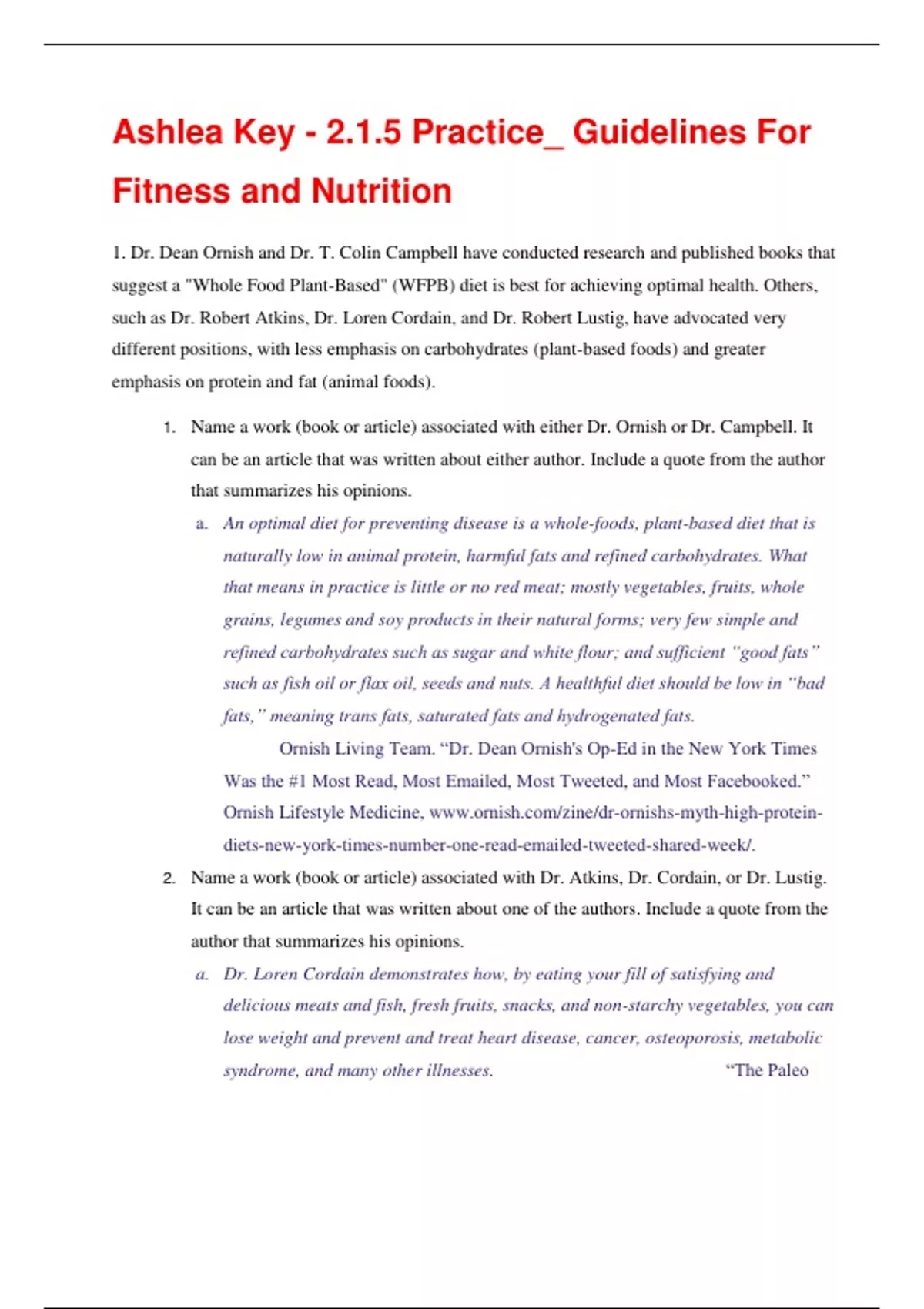 Ashlea Key 2.1.5 Practice Guidelines For Fitness and Nutrition Ashlea Key - 2.1.5 Practice_ Guidelines For Fitness and Nutrition 1. Dr. Dean Ornish and Dr. T. Colin Campbell have conducted research and published books that suggest a "Whole Food Plant-Based" (WFPB) diet is best for achieving optimal health. Others, such as Dr. Robert Atkins, Dr. Loren Cordain, and Dr. Robert Lustig, have advocated very different positions, with less emphasis on carbohydrates (plant-based foods) and greater emphasis on protein and fat (animal foods). 1. Name a work (book or article) associated with either Dr. Ornish or Dr. Campbell. It can be an article that was written about either author. Include a quote from the author that summarizes his opinions. a. An optimal diet for preventing disease is a whole-foods, plant-based diet that is naturally low in animal protein, harmful fats and refined carbohydrates. What that means in practice is little or no red meat; mostly vegetables, fruits, whole grains, legumes and soy products in their natural forms; very few simple and refined carbohydrates such as sugar and white flour; and sufficient “good fats” such as fish oil or flax oil, seeds and nuts. A healthful diet should be low in “bad fats,” meaning trans fats, saturated fats and hydrogenated fats. Ornish Living Team. “Dr. Dean Ornish's Op-Ed in the New York Times Was the #1 Most Read, Most Emailed, Most Tweeted, and Most Facebooked.” Ornish Lifestyle Medicine, 2. Name a work (book or article) associated with Dr. Atkins, Dr. Cordain, or Dr. Lustig. It can be an article that was written about one of the authors. Include a quote from the author that summarizes his opinions. a. Dr. Loren Cordain demonstrates how, by eating your fill of satisfying and delicious meats and fish, fresh fruits, snacks, and non-starchy vegetables, you can lose weight and prevent and treat heart disease, cancer, osteoporosis, metabolic syndrome, and many other illnesses. “The PaleoDiet by Dr. Loren Cordain Founder Paleo Movement.” The Paleo Diet™, 3. Compare and contrast the authors' positions. a. Dr. Ornish believes that a plant-based diet with the absence of animal protein, harmful fats and refined carbohydrates is optimal for one’s health. Dr. Cordain, however, believes that meats and fish, combined with vegetables, fruits and other food groups is the best way to stay fit. Both doctors do agree that certain “bad fats” should not be apart of one’s diet. 4. Explain the scientific basis of each author's position. a. Research shows that animal protein can drastically increase the risk of death from things like cardiovascular disease, cancer and Type 2 diabetes. Heavy consumption of saturated fat and trans fats can double a risk of getting Alzheimer’s disease. b. We also know that to maintain a healthy, strong body, we must base our meals off of the age old food pyramid. This includes meats, vegetables, fruits and more. 1. Indicate whether you agree with one or both researchers or have a different opinion. Explain your rationale. a. I believe both of the studies are valid and reasonable. Many people who I know that live a plant-based, low animal protein diet are healthier and more physically fit than those who consume meat. However, I personally eat meat and maintain a healthy lifestyle while doing so. 2. Based on what you have learned in these studies, identify three guidelines for achieving optimal health. Then describe three barriers to practicing these behaviors. Use the table to guide your response. Healthful behaviors Barriers to healthful behaviorsMental health 1. Meditation 2. Avoiding Stressful Situations 3. Maintaining Healthy Relationships 1. Stress and the Inability to Calm One’s Mind 2. Getting Involved In Fights or Drama 3. Friends Taking Advantage Of or Bullying You Physical health 1. Healthy Diet 2. Good Sleep Patterns 3. Exercising Consistently 1. Tempting Junk Foods or Ignorance 2. Stress or Distractions 3. Laziness Physical fitness 1. Exercising Constantly and Consistently 2. Staying Hydrated 3. Healthy Diet 1. Ignorance to the Importance of Exercise 2. Lack of Clean Water 3. Tempting Foods or Inability to Obtain Healthy Food 3. Name a commonly underconsumed nutrient. Then describe a long-term consequence of poor diet. Identify two additional aspects of an unhealthful lifestyle that do not involve nutrition. Explain the long-term consequences of each. (6 points) a. Iron is often under consumed by females in teenage years or while pregnant. One longterm consequence of a poor diet is the increased risk of disease, such as cancer, Type-2 diabetes and more. Two more aspects of an unhealthy lifestyle are using drugs/alcohol and lack of exercise. The use of drugs/alcohol can increase the chances of getting several types of cancers, like lung or kidney cancer. A lack of exercise can lead to obesity or diseases like diabetes. 4. School policy can influence healthful or unhealthful eating and physical activity levels. But the ways that school policy can do this is debatable. You are going to take a stance on the best ways that school policy can influence the health of students. Written debateYou will act as your own opponent and present both sides of an argument in a written debate about ways that school policy can influence healthful or unhealthful eating and physical activity levels. Read and research material relevant to the debate topic. You will then write an argument supporting the idea and a counter argument opposing the idea. Cite at least three sources in your written arguments. In the written argument you submit: 1. Cite at least three research sources you used to prepare for the debate. 2. Summarize three points of agreement and three points of disagreement between the two viewpoints you represented. 3. Finish the assignment by stating your own thoughts and opinions: What do you think are the best ways school policy can influence healthful or unhealthful eating and physical activity levels?