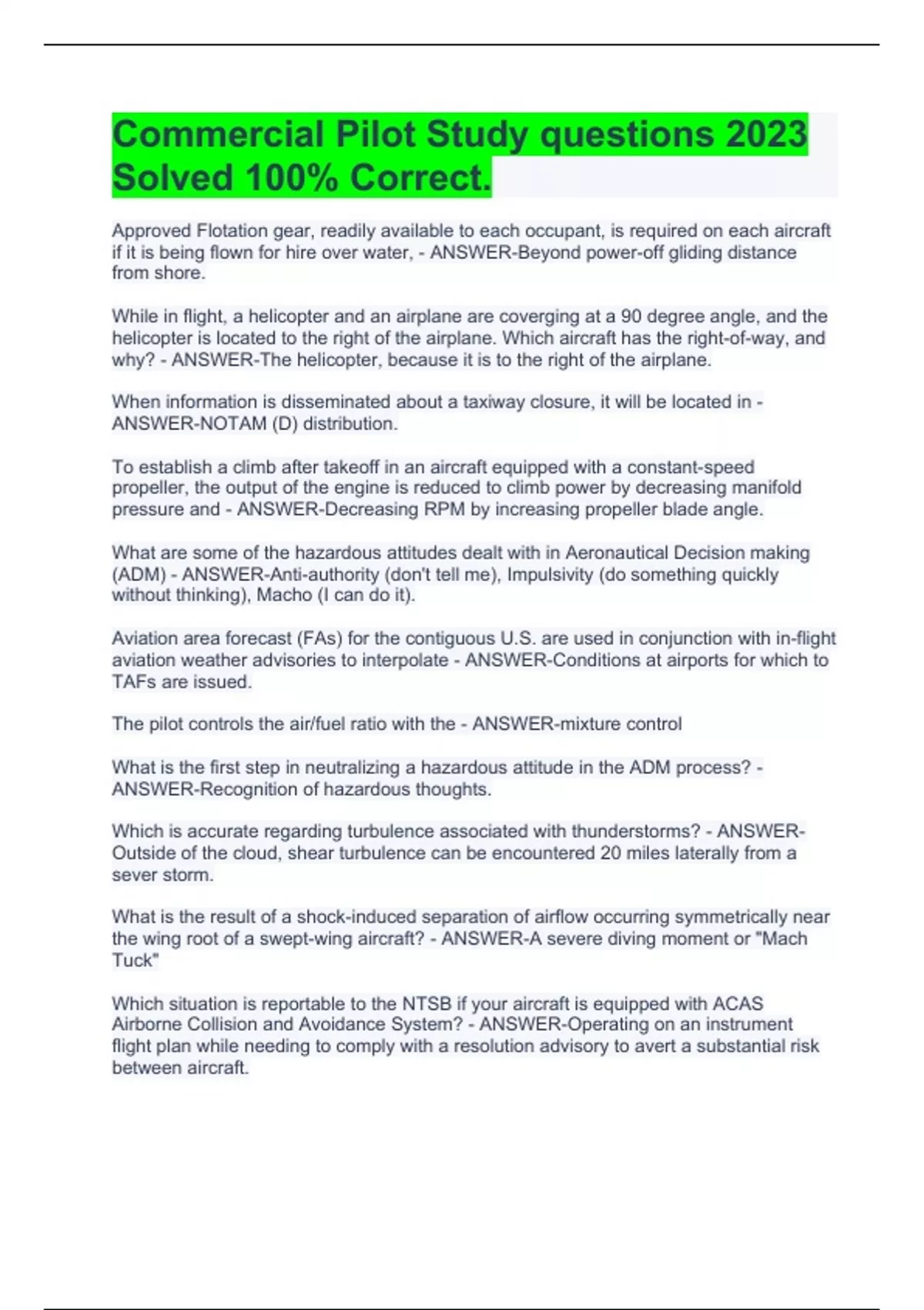 Commercial Pilot Study questions 2023 Solved 100% Correct.