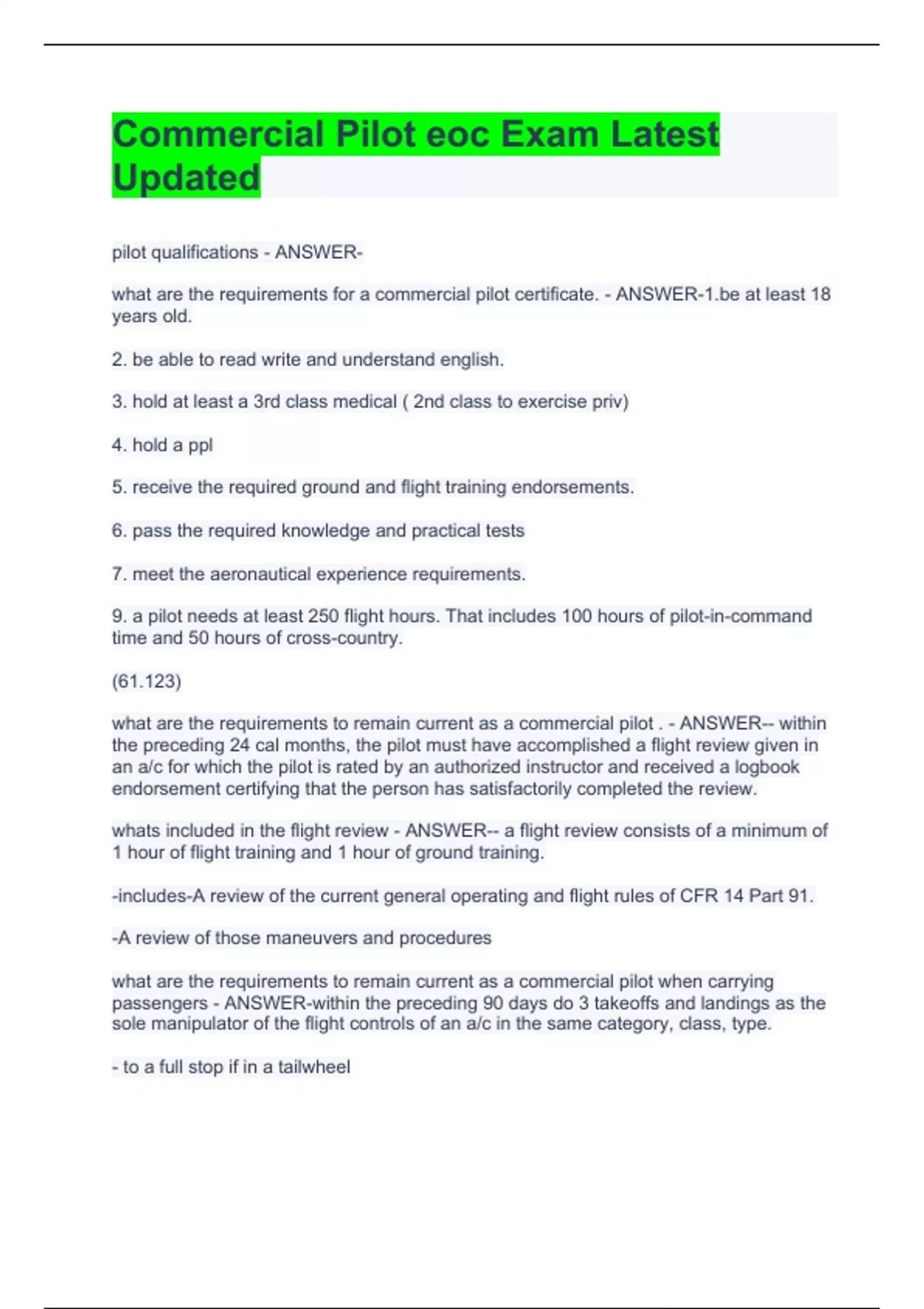 pilot qualifications - ANSWER- what are the requirements for a commercial pilot certificate. - ANSWER- at least 18 years old. 2. be able to read write and understand english. 3. hold at least a 3rd class medical ( 2nd class to exercise priv) 4. hold a ppl 5. receive the required ground and flight training endorsements. 6. pass the required knowledge and practical tests 7. meet the aeronautical experience requirements. 9. a pilot needs at least 250 flight hours. That includes 100 hours of pilot-in-command time and 50 hours of cross-country. (61.123) what are the requirements to remain current as a commercial pilot . - ANSWER-- within the preceding 24 cal months, the pilot must have accomplished a flight review given in an a/c for which the pilot is rated by an authorized instructor and received a logbook endorsement certifying that the person has satisfactorily completed the review. whats included in the flight review - ANSWER-- a flight review consists of a minimum of 1 hour of flight training and 1 hour of ground training. -includes-A review of the current general operating and flight rules of CFR 14 Part 91. -A review of those maneuvers and procedures what are the requirements to remain current as a commercial pilot when carrying passengers - ANSWER-within the preceding 90 days do 3 takeoffs and landings as the sole manipulator of the flight controls of an a/c in the same category, class, type. - to a full stop if in a tailwheel