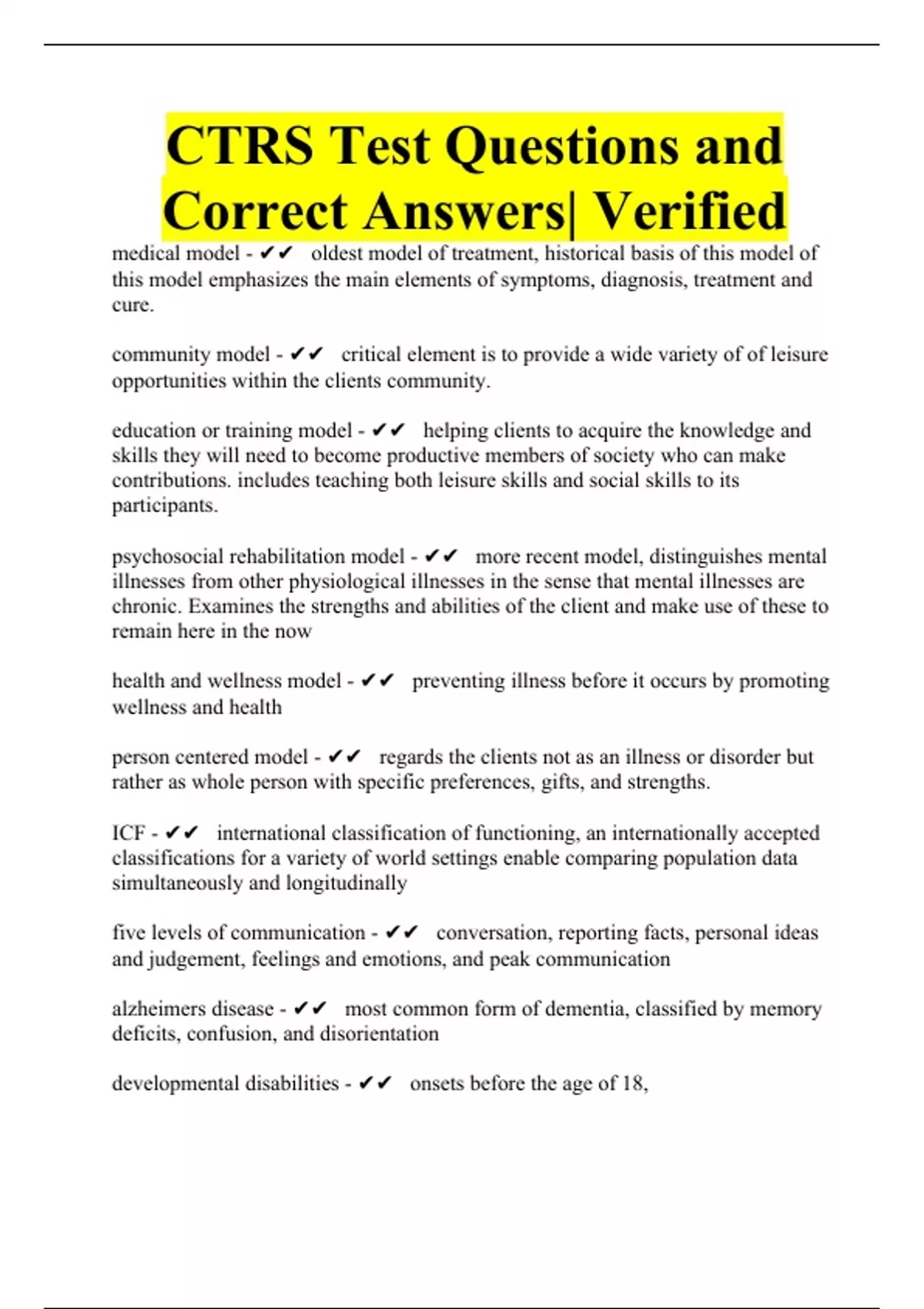 medical model - oldest model of treatment, historical basis of this model of this model emphasizes the main elements of symptoms, diagnosis, treatment and cure. community model - critical element is to provide a wide variety of of leisure opportunities within the clients community. education or training model - helping clients to acquire the knowledge and skills they will need to become productive members of society who can make contributions. includes teaching both leisure skills and social skills to its participants. psychosocial rehabilitation model - more recent model, distinguishes mental illnesses from other physiological illnesses in the sense that mental illnesses are chronic. Examines the strengths and abilities of the client and make use of these to remain here in the now health and wellness model - preventing illness before it occurs by promoting wellness and health person centered model - regards the clients not as an illness or disorder but rather as whole person with specific preferences, gifts, and strengths. ICF - international classification of functioning, an internationally accepted classifications for a variety of world settings enable comparing population data simultaneously and longitudinally five levels of communication - conversation, reporting facts, personal ideas and judgement, feelings and emotions, and peak communication alzheimers disease - most common form of dementia, classified by memory deficits, confusion, and disorientation developmental disabilities - onsets before the age of 18, intellectual disabilities - IQ below 70 autism spectrum disorders - characterized by 2 main domains, social interaction and social communication and restricted, repetitive behaviors, interests and activities leisure ability model - functional intervention, leisure education, recreation participation health protection/ health promotion model - reduces injury, disability, and or illness and promotes prevention of illness tr service delivery model - needs assessment and or diagnosis, rehabilitation or treatment for a need or problem, educational services, activities for prevention and health promotion. involves formative evaluation principles of ATRA's code of ethics - beneficence/ non maleficence, autonomy, justice, fidelity, veracity/ informed consent, confidentiality and privacy, competence, and compliance with laws and regulations free time and boredom assessment - 1995, self report assessment, measures meaningfulness, mental involvement, speed of time, and physical involvement Measurement of social empowerment and trust - 1991, tests how clients' perceived social attitudes and skills have changed due to participation in TR treatment, measures: bonding/ cohesion, empowerment, self-awareness, self affirmations, and awareness of others CERT-PB - 1995, comprehensive evaluation in rec therapy- psychiatric/ behavioral,uses an observational checklist to establish a baseline; gross motor function, fine motor function, locomotion, motor skills, sensory, cognition, communication, and behavior CERT- PD - 1988, assessment that uses an observational checklist for people with physical disabilities and establishes a baseline of levels of client functional skills needed for leisure activities