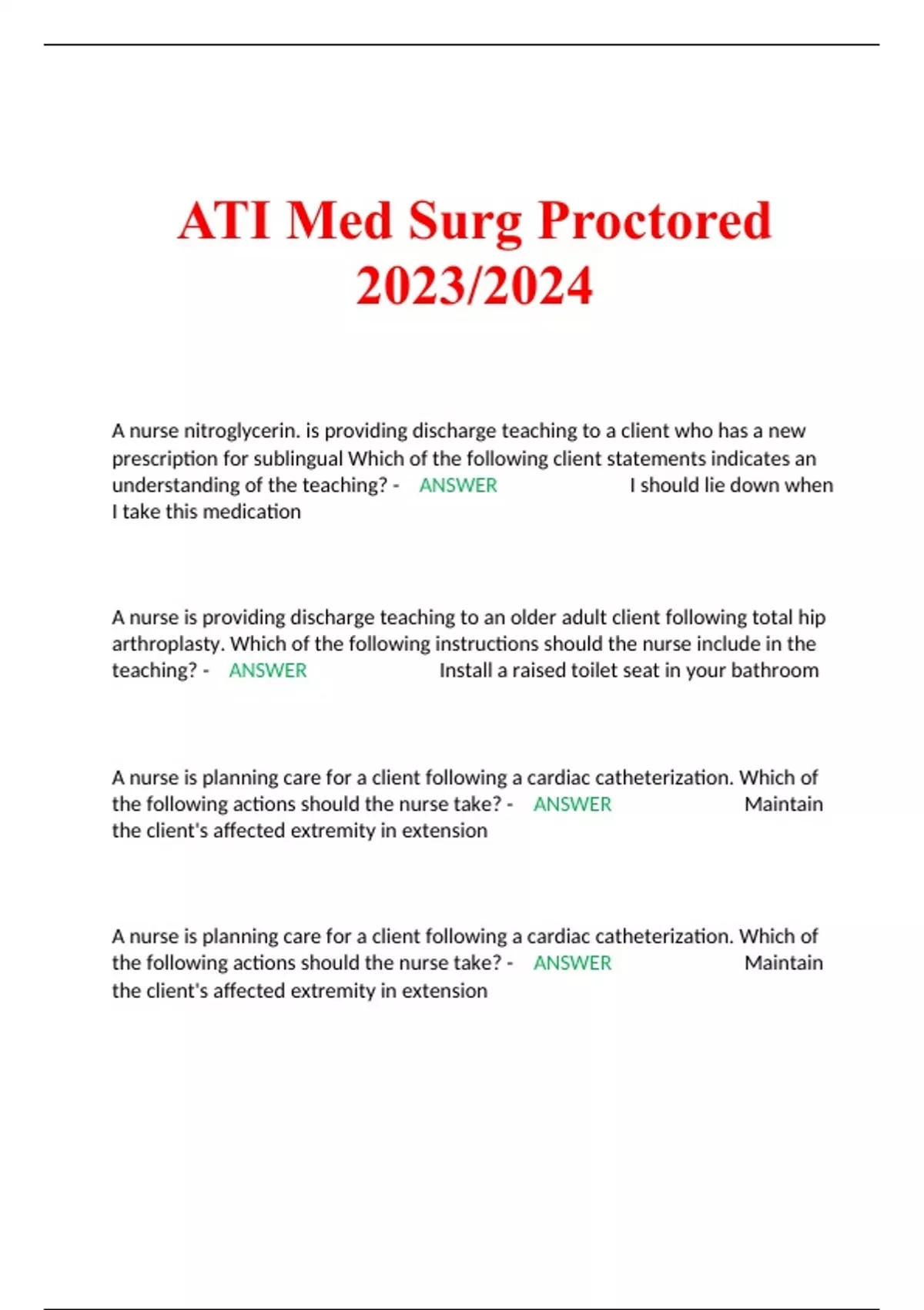 ATI Med Surg Proctored 2023/2024 A nurse nitroglycerin. is providing discharge teaching to a client who has a new prescription for sublingual Which of the following client statements indicates an understanding of the teaching? - ANSWER I should lie down when I take this medication A nurse is providing discharge teaching to an older adult client following total hip arthroplasty. Which of the following instructions should the nurse include in the teaching? - ANSWER Install a raised toilet seat in your bathroom A nurse is planning care for a client following a cardiac catheterization. Which of the following actions should the nurse take? - ANSWER Maintain the client's affected extremity in extension A nurse is planning care for a client following a cardiac catheterization. Which of the following actions should the nurse take? - ANSWER Maintain the client's affected extremity in extension A nurse is caring for a client who has a lower extremity fracture and a prescription for crutches. which of the following client statements indicates that the client is adapting to their role change? - ANSWER I will need to have my partner take over shopping for groceries and cooking the meals for us A nurse is providing teaching to a client who has an impaired immune system due to chemotherapy. which of the following information should the nurse include in the teaching? - ANSWER Change your pet's litter box daily a nurse is caring for a client who has a contusion and reports thirst. The client's urinary output was 4,000 ml over past 24 hr, the nurse should anticipate a prescription for which of the following IV medications? - ANSWER Desmopressin