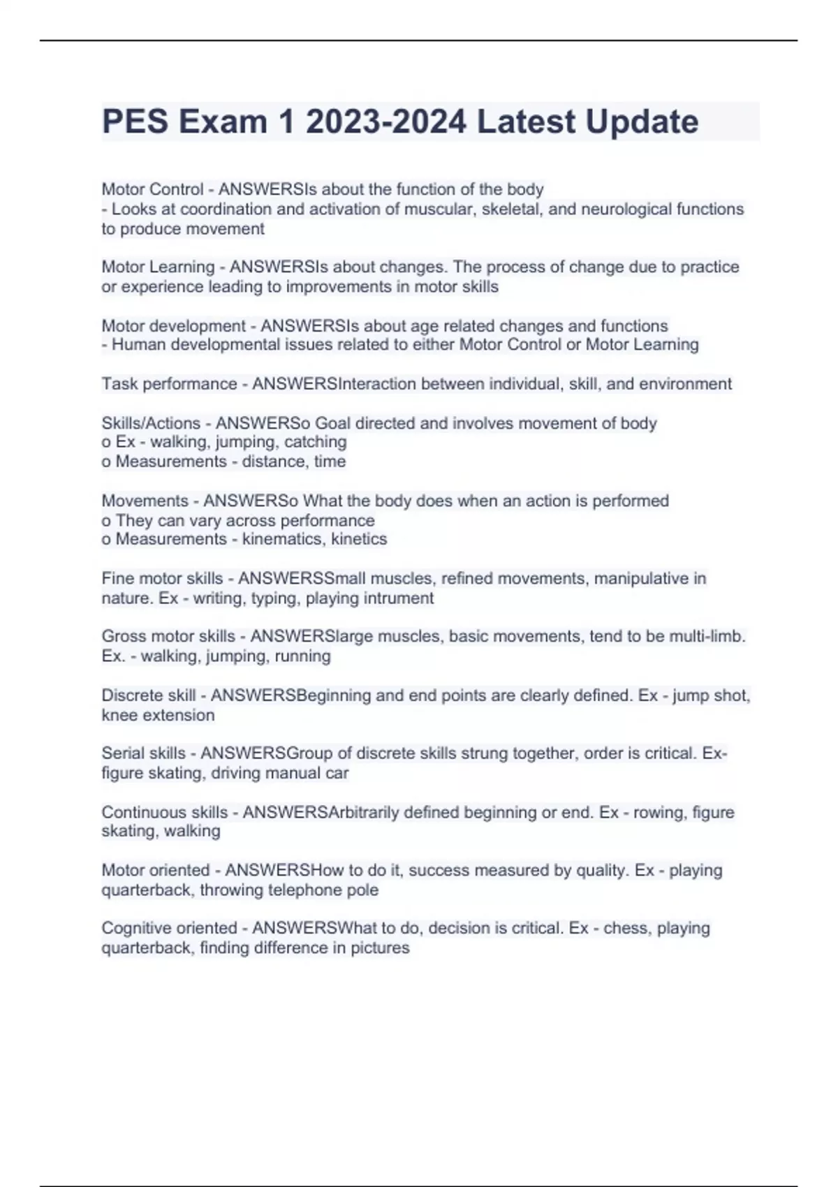 Motor Control - ANSWERSIs about the function of the body - Looks at coordination and activation of muscular, skeletal, and neurological functions to produce movement Motor Learning - ANSWERSIs about changes. The process of change due to practice or experience leading to improvements in motor skills Motor development - ANSWERSIs about age related changes and functions - Human developmental issues related to either Motor Control or Motor Learning Task performance - ANSWERSInteraction between individual, skill, and environment Skills/Actions - ANSWERSo Goal directed and involves movement of body o Ex - walking, jumping, catching o Measurements - distance, time Movements - ANSWERSo What the body does when an action is performed o They can vary across performance o Measurements - kinematics, kinetics Fine motor skills - ANSWERSSmall muscles, refined movements, manipulative in nature. Ex - writing, typing, playing intrument Gross motor skills - ANSWERSlarge muscles, basic movements, tend to be multi-limb. Ex. - walking, jumping, running Discrete skill - ANSWERSBeginning and end points are clearly defined. Ex - jump shot, knee extension Serial skills - ANSWERSGroup of discrete skills strung together, order is critical. Ex- figure skating, driving manual car Continuous skills - ANSWERSArbitrarily defined beginning or end. Ex - rowing, figure skating, walking Motor oriented - ANSWERSHow to do it, success measured b
