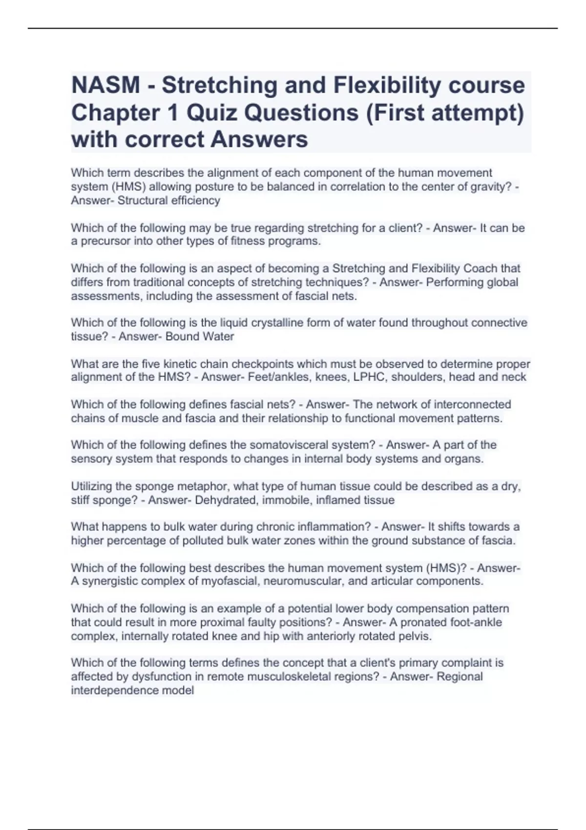 NASM - Stretching and Flexibility course Chapter 1 Quiz Questions (First attempt) with correct Answers