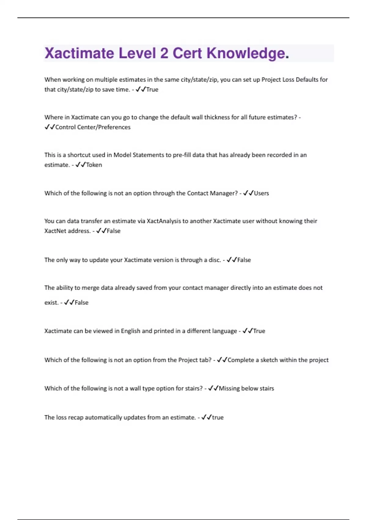 When working on multiple estimates in the same city/state/zip, you can set up Project Loss Defaults for that city/state/zip to save time. - True Where in Xactimate can you go to change the default wall thickness for all future estimates? - Control Center/Preferences This is a shortcut used in Model Statements to pre-fill data that has already been recorded in an estimate. - Token Which of the following is not an option through the Contact Manager? - Users You can data transfer an estimate via XactAnalysis to another Xactimate user without knowing their XactNet address. - False The only way to update your Xactimate version is through a disc. - False The ability to merge data already saved from your contact manager directly into an estimate does not exist. - False Xactimate can be viewed in English and printed in a different language - True Which of the following is not an option from the Project tab? - Complete a sketch within the project Which of the following is not a wall type option for stairs? - Missing below stairs The loss recap automatically updates from an estimate. - trueWhen using the Custom staircase tool, after clicking once, the RED measurement indicates what? - The total rise of the staircase This tool allows you to change the direction that the sloped or peaked ceiling is running? - Orientation When adding a new level, how many feet will sketch add or subtract from the previous level? - 9 In Sketch, the keyboard shortcut for resetting your visible windows is CTRL + SHIFT + R. - True There is no way to re-organize the members of the Grouping pane in Estimate Items - False Which of the following are Roof Variables - SF, SQ, HIP, VAL, R, P