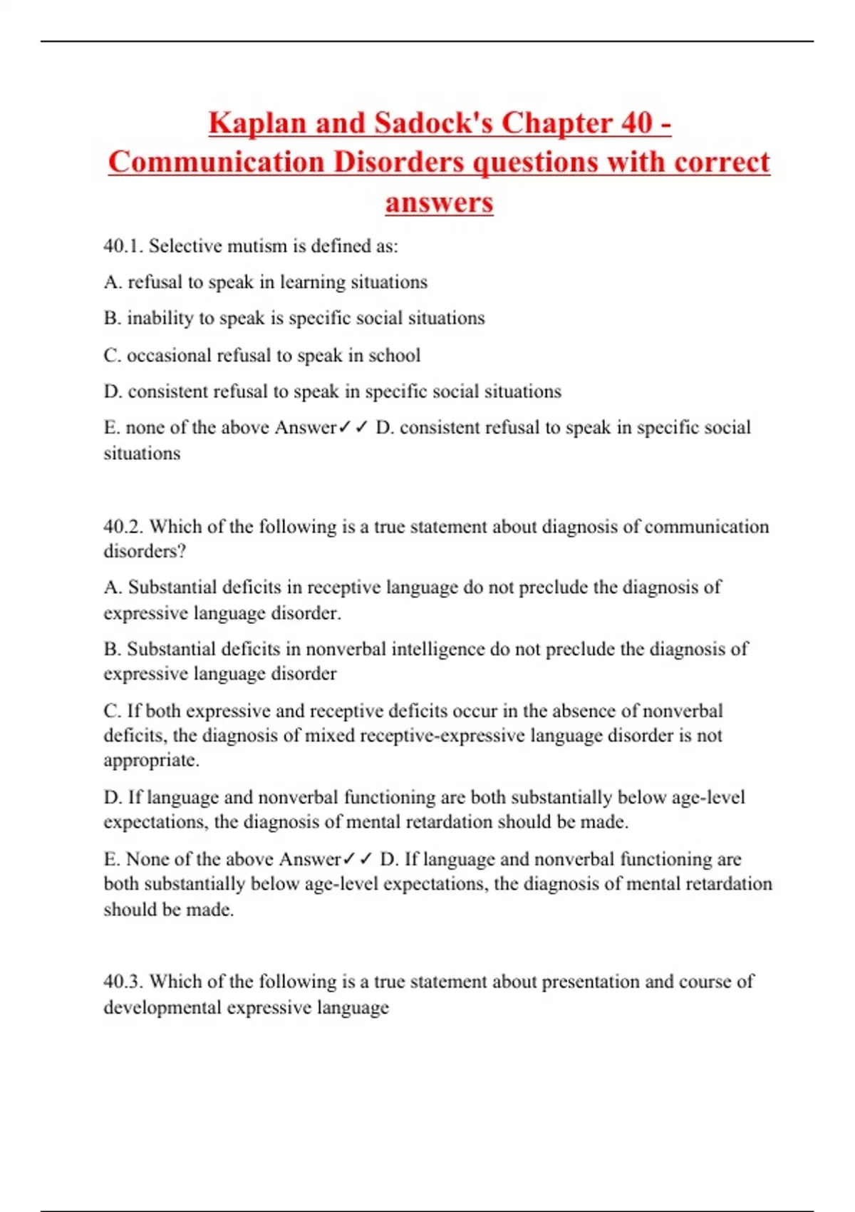 40.1. Selective mutism is defined as: A. refusal to speak in learning situations B. inability to speak is specific social situations C. occasional refusal to speak in school D. consistent refusal to speak in specific social situations E. none of the above Answer D. consistent refusal to speak in specific social situations 40.2. Which of the following is a true statement about diagnosis of communication disorders? A. Substantial deficits in receptive language do not preclude the diagnosis of expressive language disorder. B. Substantial deficits in nonverbal intelligence do not preclude the diagnosis of expressive language disorder C. If both expressive and receptive deficits occur in the absence of nonverbal deficits, the diagnosis of mixed receptive-expressive language disorder is not appropriate. D. If language and nonverbal functioning are both substantially below age-level expectations, the diagnosis of mental retardation should be made. E. None of the above Answer D. If language and nonverbal functioning are both substantially below age-level expectations, the diagnosis of mental retardation should be made. 40.3. Which of the following is a true statement about presentation and course of developmental expressive language